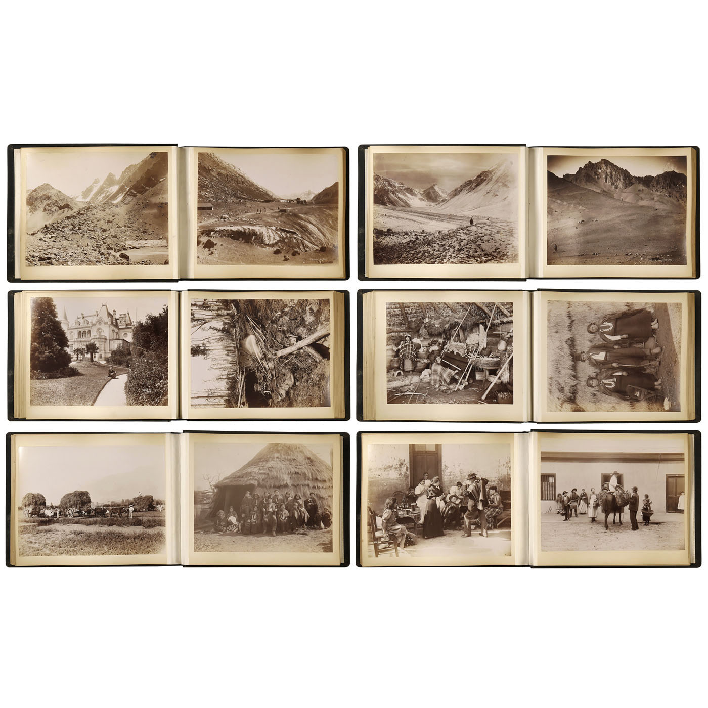 35 x 26 cm, with rayskin covers, 25 removable plates with 50 albumen images of 10 ½ x 8 ½ in., motifs from South America, several with text embedded in the image, without mention of the photographer, image tone well-preserved, rare travel photographs. Motifs include Valle del Inca, Rio Aconcagua, El Hito, scenes from the high mountains of the Andes, Cacheuta, Concepcion, Talcahuano, beach scenes, the castle Castillo Lota, Valdivia and 18 photographs of inhabitants.