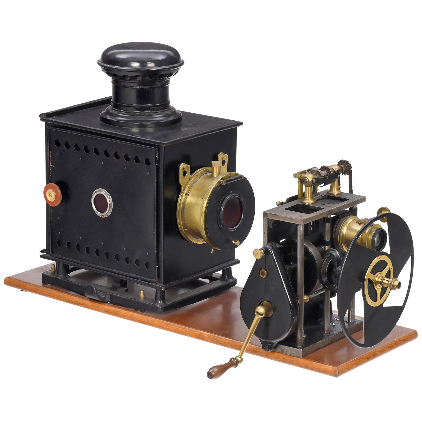 Pathé, Paris. Table cinematograph for 35mm film strips, consisting of Pathé-Frères projection head no. 36191 with Maltese cross transport and front panel, hand-turned mechanism, original Pathé lens with 60 mm focal length, Pathé lamphouse with double condenser for the projection light of the CARBUROT (Paris) gas lamp. – In addition: German publication on limelight burners. – Concave mirror in lamphouse present but defective. – Note: Using a gas (hydrogen/oxygen) mixture, limestone is heated until it is white hot and emits a powerful white light. The electrification of Central European cities, which began at the end of the 19th century, did not reach smaller communities until the 1930s. Until then, projection was only possible with limelight.