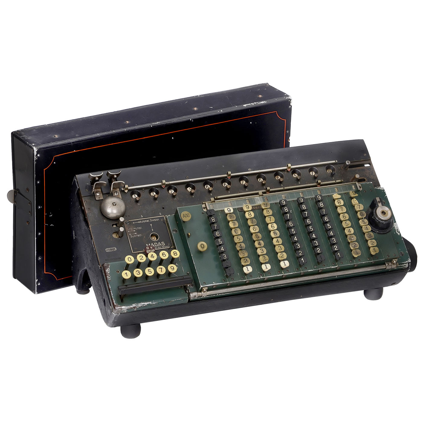 Very interesting Swiss stepped-drum calculating machine with keyboard setting, manufactured by H.W. Egli AG., Zurich. For the 4 basic arithmetic operations including automatic division. 9-digit setting keys, 7-digit revolving register and l2-digit result register, electric motor drive (untested), missing 3 key pads, serial no. 40981. With tin cover.