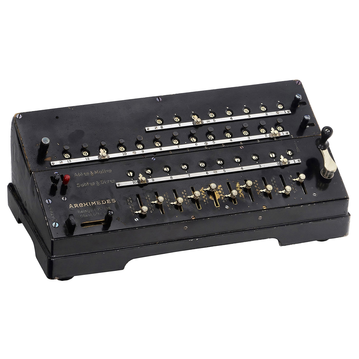 1) Peerless Baby calculating machine, c. 1922, miniature German 4-species stepped-drum calculator by Math. B?uerle, St. Georgen, Black Forest, serial no. 5605, cast-iron case, with 9, 8 and 12 digits, very good original working condition.