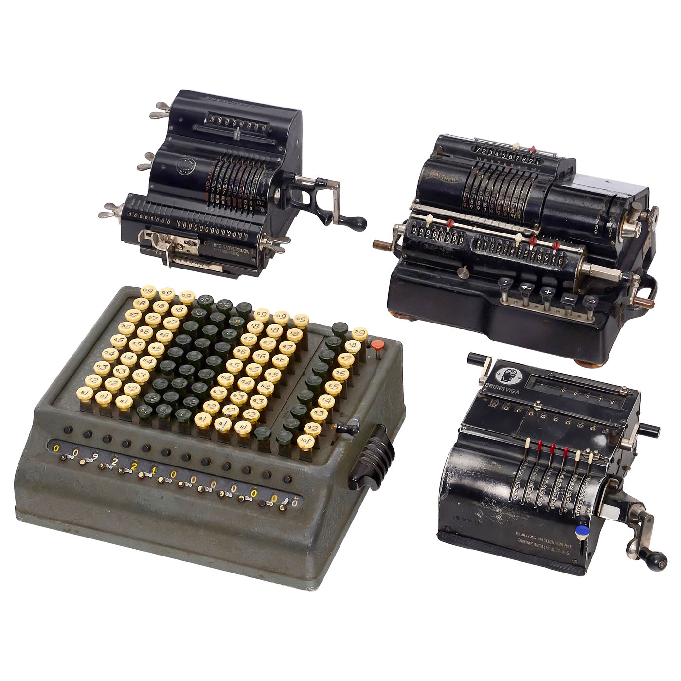 1) Brunsviga 10, c. 1935, no. 185517, Grimme, Natalis & Co., Braunschweig, split stepped drum, with 6, 5 and 10 digits, working.