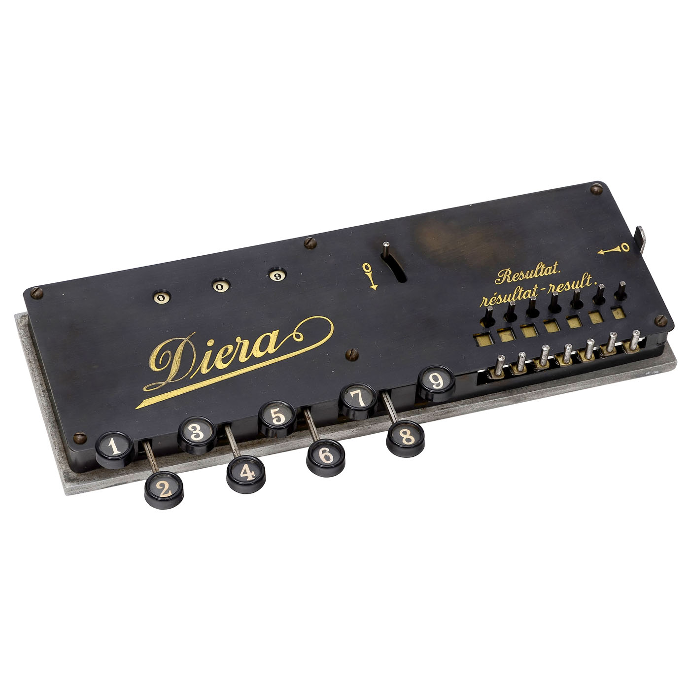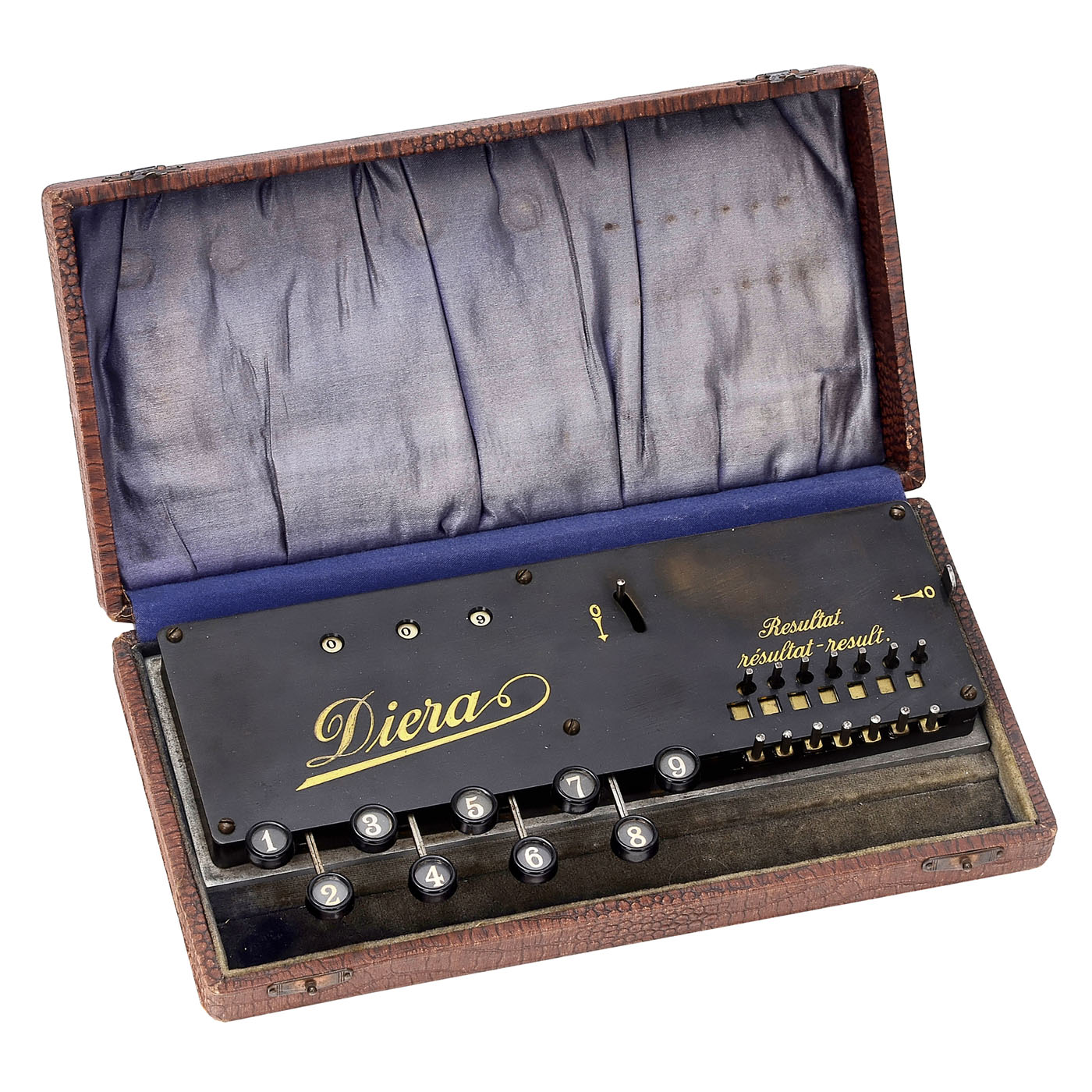 Adix Company Pallweber & Bordt, Mannheim, Germany. Serial no. 1587, adding machine with switching latch drive (similar to the Adix but hidden under the cover-plate), 9-digit setting keyboard, 3-digit results movement with erasing lever for the 2 left digits, 8-digit memory movement with key erasing, in original velvet and silk-lined case.