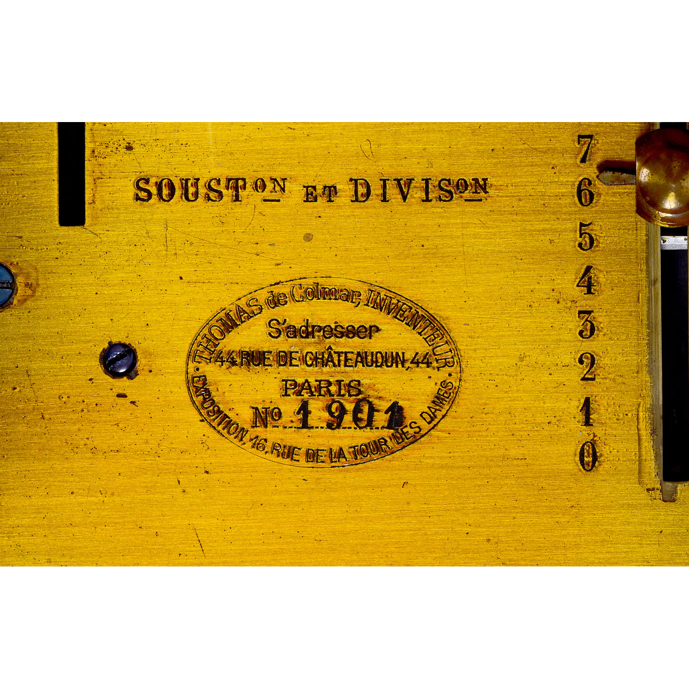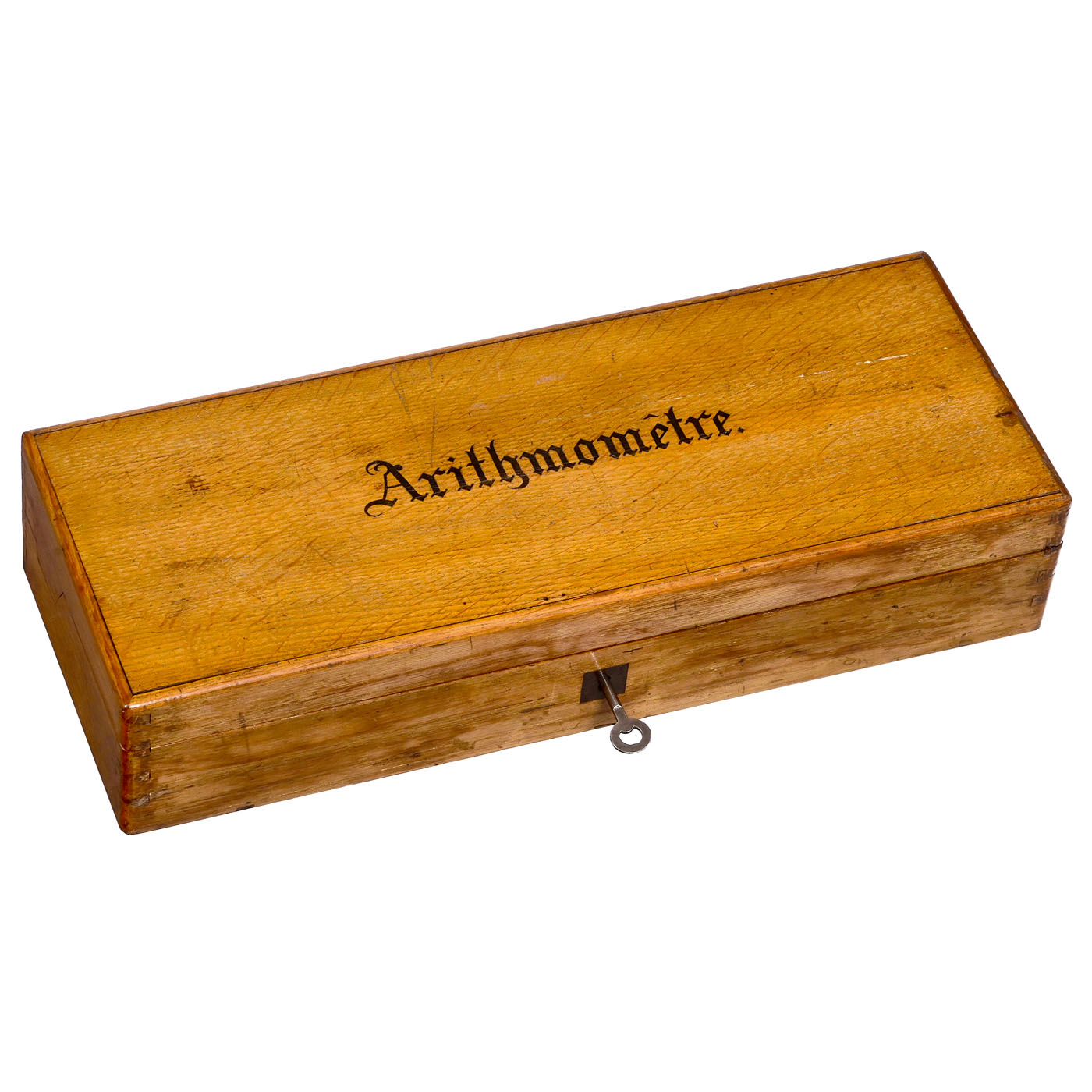 1st calculator in the world produced in series. Invented 1820 by Charles Xavier Thomas, Colmar/Alsace, later Paris. Marked: "Thomas de Colmar, Inventeur, 44 Rue de Chateaudun, Paris", with 6 input sliders, 7-digit revolution counter and 12-digit results mechanism. Serial no. 1915, brass mechanism in oak case, with lock and key, excellent working condition.