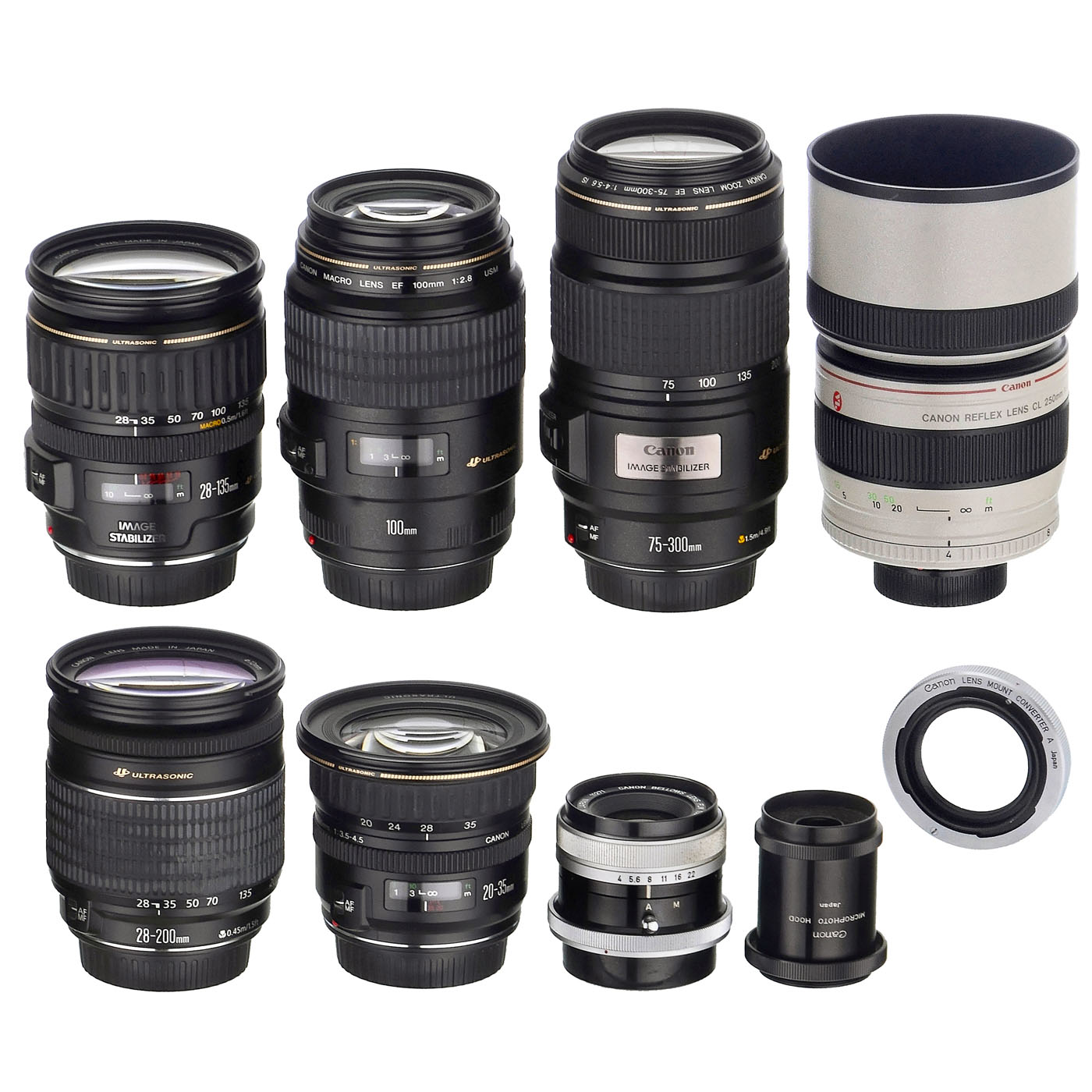 Canon, Japan. All lenses perform well to clean under point light, all with caps, and not tested for autofocus. 1) EF 3,5ÿ4,5/20ÿ35 mm USM with box. ÿ 2) EF 3,5ÿ5,6/28ÿ135 mm USM IS with box. ÿ 3) 3,5ÿ5,6/28ÿ200 mm USM. ÿ 4) EF 4ÿ5,6/75ÿ300 mm USM IS. ÿ 5) EF 100 mm f/2.8 Macro. ÿ 6) Reflex CL 250 mm f/4 "Interchangeable Video Lens", adapted to M42 mounts for close-up shots (especially due to UV), white body with red ring, and with lens hoods. ÿ And: 7ÿ9) Canon Bellows Lens FLM 4/100 mm, Microphoto Hood and Canon Lens Mount Adapter A.