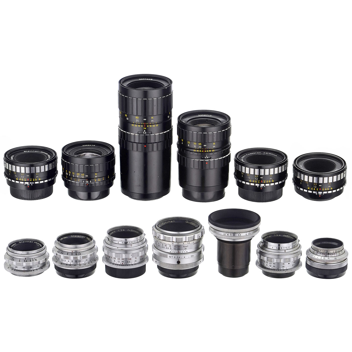 Steinheil, Munich. Three different design series ÿ first the early 1950s in chrome/aluminum, then the black zebra design of the late 1950s, and finally the modern BV series. All lenses in normal to very good condition. 1) Quinon 1.9/55 mm, Optigon-Automatic too slow. ÿ 2) Culmigon 4.5/35 mm. ÿ 3) Cassaron 3.5/40 mm. ÿ 4) Cassar S 2.8/50 mm. ÿ 5) Culminar 2.8/50 mm. ÿ 6) Cassarit 2.8/50 mm. ÿ 7) Makro-Cassarit 3.5/50 mm, head, rare! ÿ 8) Auto-Cassaron 2.8/50 mm. ÿ 9) Edixa-Auto-Cassaron 2.8/50 mm. ÿ 10) BV-Culmigon 3.5/35 mm. ÿ 11) BV-Cassarit 3.5/100 mm. ÿ And: 12) BV-Cassarit 3.8/135 mm.