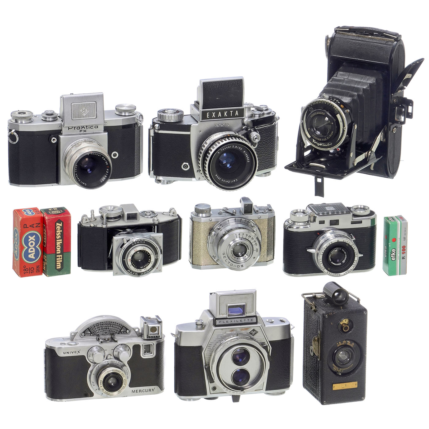 9 cameras with different image formats, 1927 onwards. 1) Ansco, Binghamton, USA. "Memo", version from 1927. A competitor to the Leica at the time, 18 x 23 mm format on 35mm Leica film, wooden case with black leather, shutter speed 1/25ÿ1/100 sec., with a special internal cassette. (3/2-) ÿ 2) Agfa in Munich. "Karat 4.5", c. 1938. Second version of the Karat for 35mm film, internal Karat cassette for 12 exposures, Opar 4.5/5.3 cm lens, shutter speed 1/25ÿ1/125 sec. Spread design. (3+/3+) ÿ 3) Agfa in Munich. "Agfa Flexilette", 1960. 2 x Color Apotar 2.8/45 mm with Prontor shutter. After the Zeiss Contaflex TLR camera, only the second TLR camera for 35mm film made in Germany. The camera's winding mechanism jams. (3ÿ4/5) ÿ 4) Kamerawerkst?tten in Dresden. "Praktica FX", 1954. Version still without automatic return mirror, shutter speed 1ÿ1/1000 sec. (inaccurate), Zeiss Tessar 2.8/50 mm T. Production period only from June 1954 to September 1954. (3-/4-) ÿ 5) Ihagee in Dresden. "Exakta Varex IIb", 1963. The People's Camera of the former GDR, export version, with Tessar 2.8/50 mm, waist-level viewfinder, focal plane shutter works imprecisely, in optically very good condition. (2+/4). ÿ 6) Bolsey, USA. "Bolsey Jubilee", 1955. 35mm camera with Steinheil Anastigmat 2.8/45 mm lens, dust-tight shutter, and rangefinder. (3+/-) ÿ 7) Universal Camera Corp., USA. "Mercury, Model CC", 1938. First Mercury model, 18 x 24 mm format on 35mm film, Tricor Anastigmat 3.5/35 mm lens, rotary shutter (releases!) 1/20ÿ1/1000 sec. Not frequently offered in Germany. (3/3+) ÿ 8) Toakoki Seisakusho, Japan. "Gold Gelto D-III", c. 1950, "Made in occupied Japan", heavy all-metal body, for film type 127, Grimmel Anastigmat 3.5/5 cm, Gelto D-III shutter. With original Gelto rangefinder. Rare! (3+/3+) ÿ And: 9) Voigtl?nder in Braunschweig. "Bessa 6 x 9 cm", 1945. Rollfilm camera, image format 6 x 9 cm on film type 120, Voigtar 4.5/11 cm, shutter speed 1ÿ1/200 sec., pop-up viewfinder. (3/3+) ÿ In addition: 3 original packaged rollfilms from Adox, Zeiss Ikon and Efke.