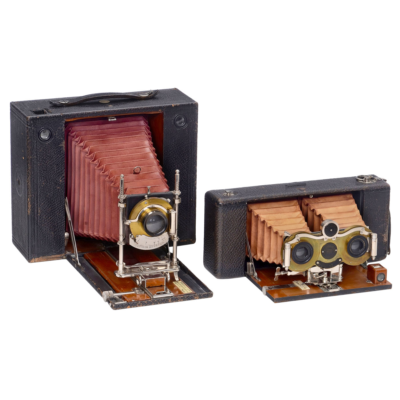 Eastman, Rochester. 1) Stereo Hawkeye Model 4 no. 9981, format 3 ? x 3 ? in., on 90 mm wide film, version with Goerz Dagor 6.8/120 mm, shutter releases perfectly, glass is clean under point light, standard is stable. (3/2-) ÿ 2) No. 5 Cartridge Kodak Model E, for 5 x 7 in. for film or plates, Bausch & Lomb Rapid Rectilinear in Eastman Kodak shutter, working, with film and plate back, focusing screen back, and 3 double cassettes. (3-/3) ÿ 3) Kodak View Camera 2-D, for 8 x 10 in., with extension and focusing screen back. (3/3) ÿ And: 4) Over 30 catalogs, brochures and image samples from 1894 onwards, in varying conditions.