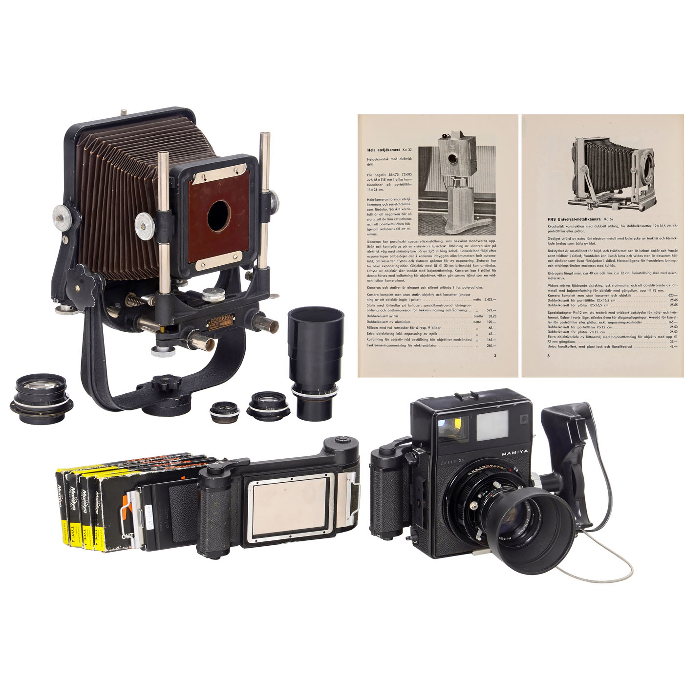1) Fotekna, Denmark. Fotekna no. 3075, c. 1945, optical bank camera for 91 x 116 mm sheet film format, focusing of the 26 cm long double rod via a central drive, front can be adjusted up and down as well as on two axes. With a 94 x 94 mm plate, a Cooke set suitable for this camera with this focus was intended: Taylor-Hobson, London. All lenses are coated and good to clean under point light: Cooke Wide-Angle Anastigmat Series VIIB 6.5/108 mm and 6.5/158 mm (with screw-on ring), Cooke Aviar Series II 4.5/210 mm (with screw-on ring), and Cooke Telephoto Anastigmat Series VIII 5.6/320 mm. (3+/3) ÿ 2) Danish photo catalog 1951, 221 pages, on page 6 the successor to the Fotekna as the FNS universal metal camera, and very interesting on page 3 is the previously unknown futuristic studio camera "Hela" with electric operation. ÿ And: 3) Mamiya, Japan. Mamiya Super 23, professional 6 x 9 cm rangefinder camera with interchangeable Sekor 3.5/100 mm, with lens hood, two 6 x 9 cm magazines, and four sheet film cassettes. (3-/3+)
