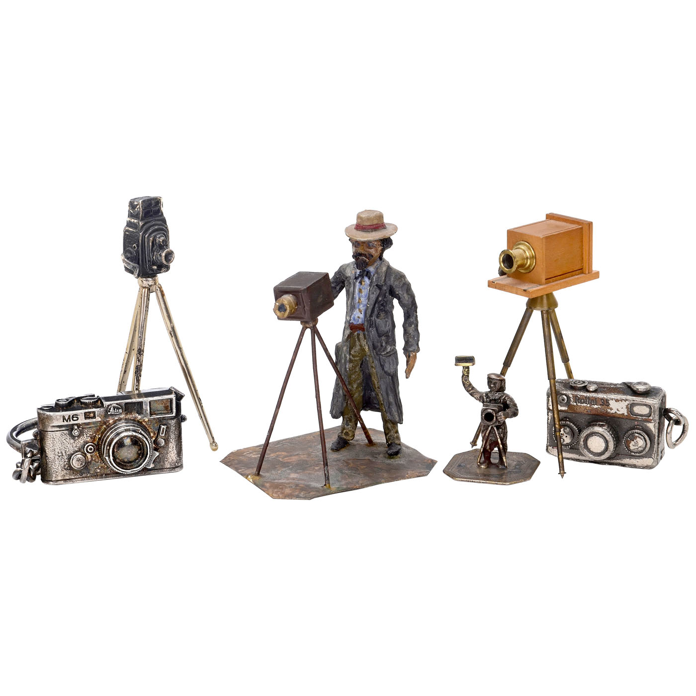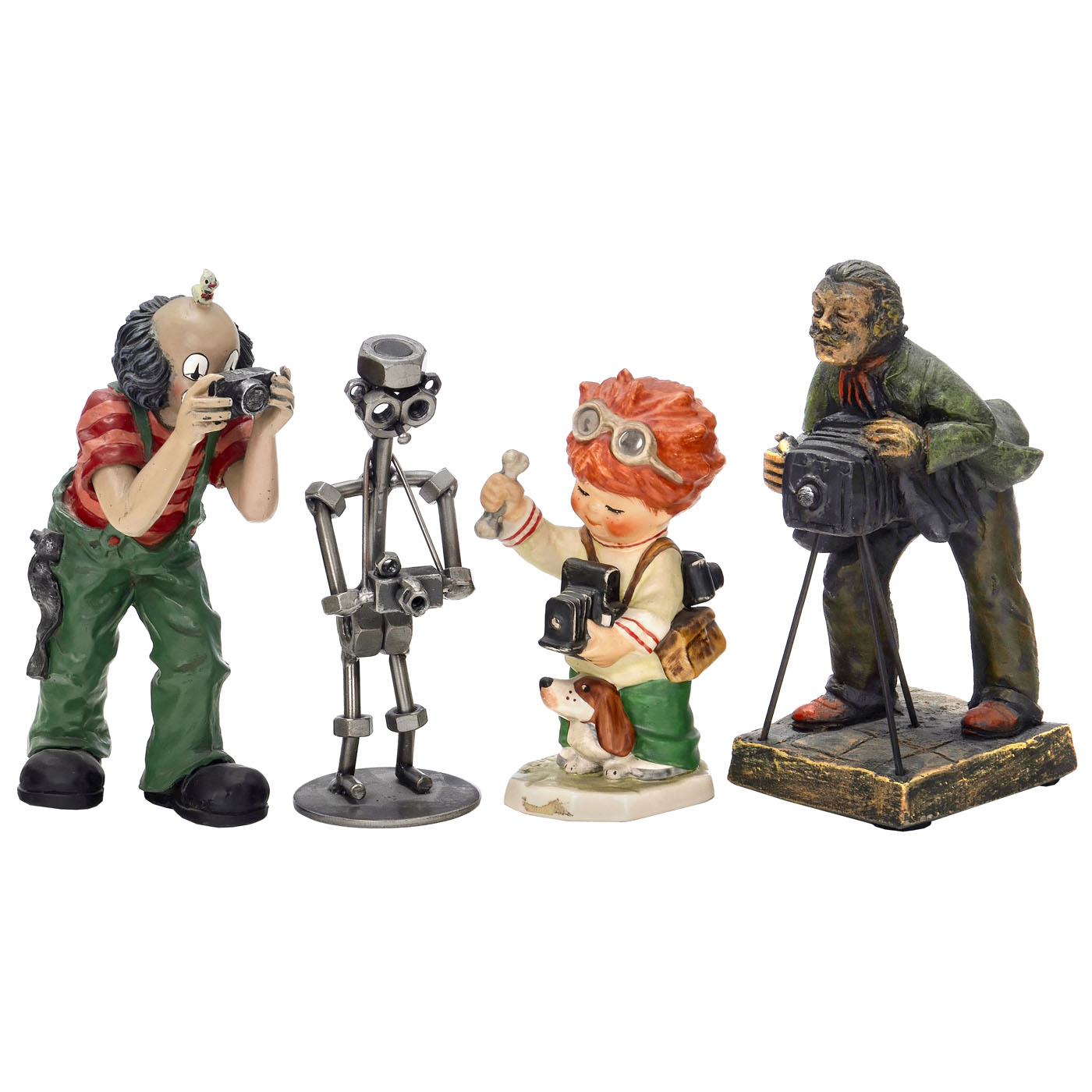1) Goebel figurine, BYJ 79, "Photographer", model from 1971, artist: Charlot Byj. Height of figurine: 15 cm. Very rare! ÿ 2) "Photographer with Travel Camera", model no. 458, c. 1970ÿ80. Mat Wanders, sculptor and designer from Limburg. Stoneware, height 19 cm. ÿ 3) Small tin figure "Daguerreotypist", unmarked, hand-painted, mounted on a sheet metal plate, height only 6 cm. ÿ 4) Miniature figurine "Photographer", made of sterling silver, engraved: Lion (England), photographer with travel camera and flash gun, height only 3 cm. ÿ 5) Gilde Handwerk, Bocholt, Germany. "Clown" with a camera between his hands, hand-painted, c. 1990s, height 19 cm. ÿ 6) Steemo, Screw Man "Photographer", height 16 cm. ÿ 7) "Nadar in an Airship", c. 1990, manufacturer unknown. Made of plastic and copper, for hanging, height 12 cm. ÿ 8) Small "Rolleiflex" on a tripod, sterling silver, height 6.5 cm. Rare and sought-after! ÿ 9) Small "Early Sliding Box Camera" on tripod, plastic and brass, height 6 cm. ÿ And: 10) 2 silver keychains, "Leica M6" and "Rollei 35".