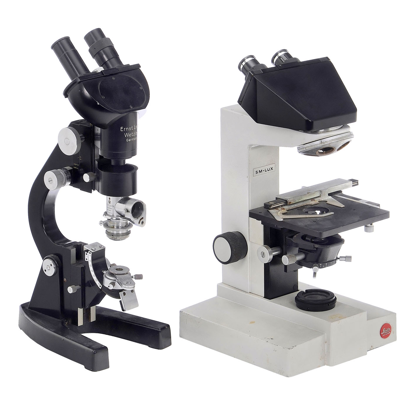 Wetzlar. 1) Laborlux SM, binocular microscope, no. 496227, 1956, electric illumination, condenser, rectangular stage, quadruple turret with objectives, binocular tube l.25x, height 36 cm.