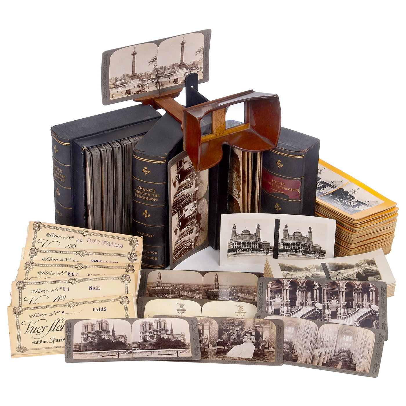 All for 9 x 18 cm, cards mostly in good condition, some with slight age spots. 1) Underwood book-form case "France through the Stereoscope", with 100 stereo cards by Underwood, only of France.