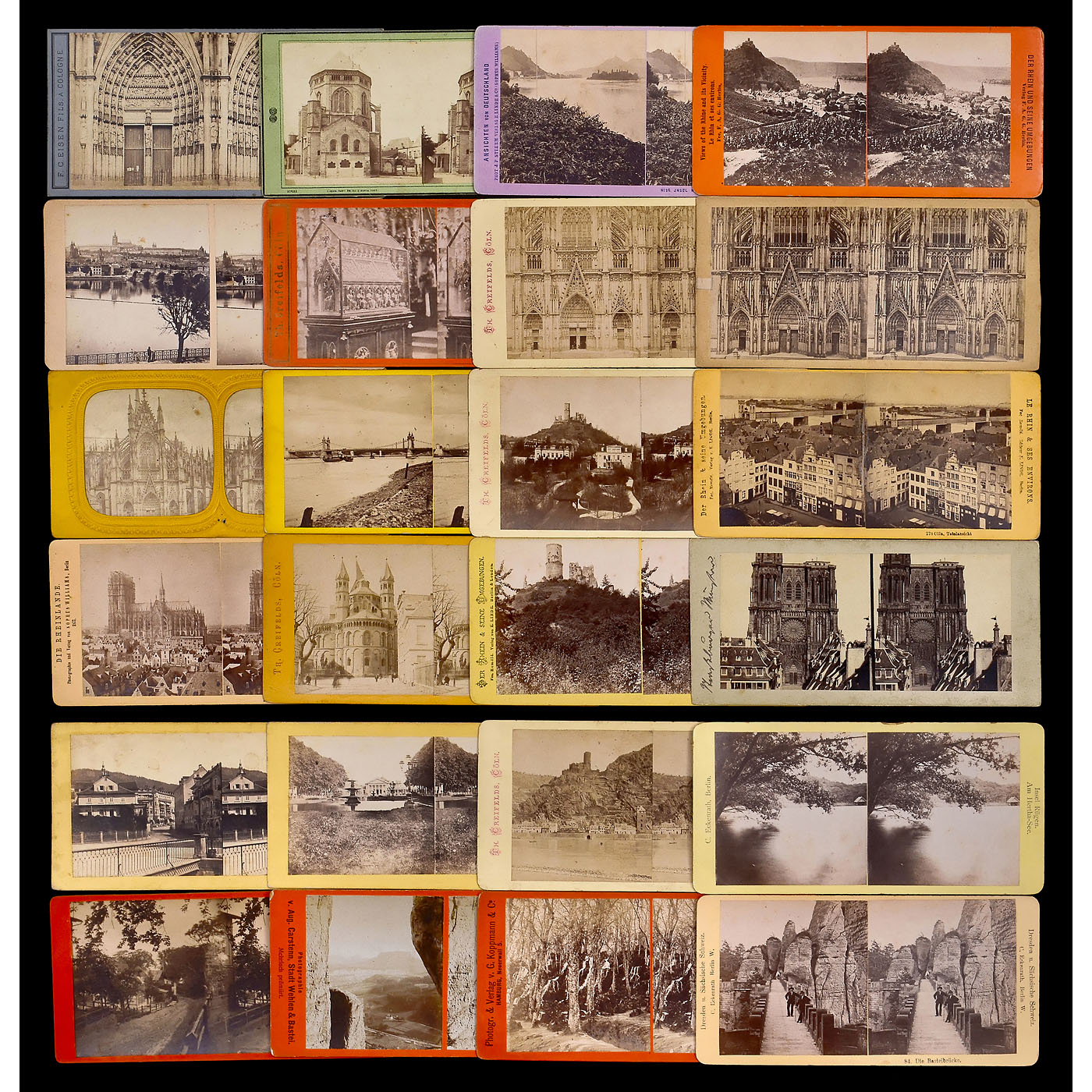 All stereo cards for 9 x 18 cm, in varying condition, but without major flaws. 1) Stereo viewer, elegantly shaped, curved housing with burl wood veneer, focusable eyepieces, with mirror flap. (3/3)