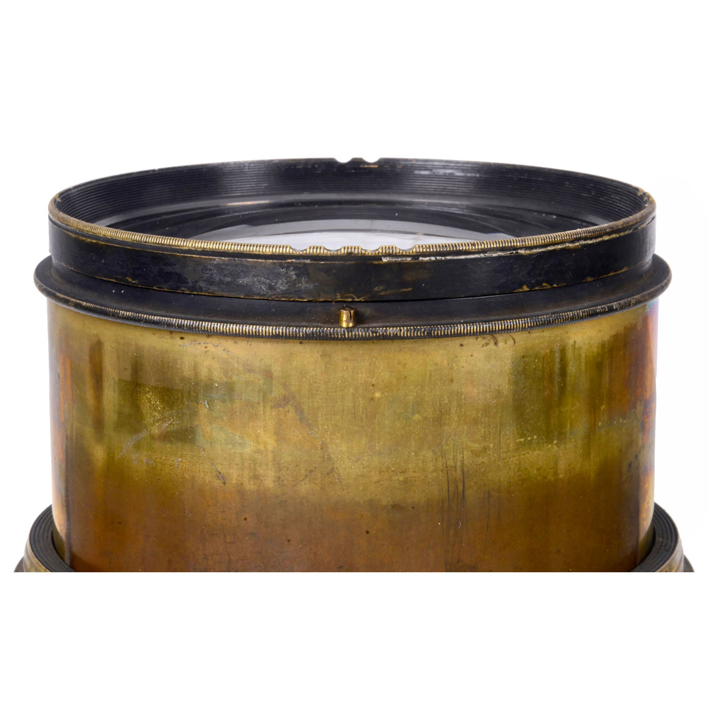 J.H. Dallmeyer, London. No. 27657, focal length approx. 11 in., for Waterhouse stops (with one for stop 11.3), height 8 in., front element ? 8,9 cm, rear lens with smoothly movable soft-focus adjustment, glass clean under point light, front lens has a cementing defect about 2 mm wide on one third of the outermost edge (of no importance for the application), all lens parts movable, lens hood with some dents.