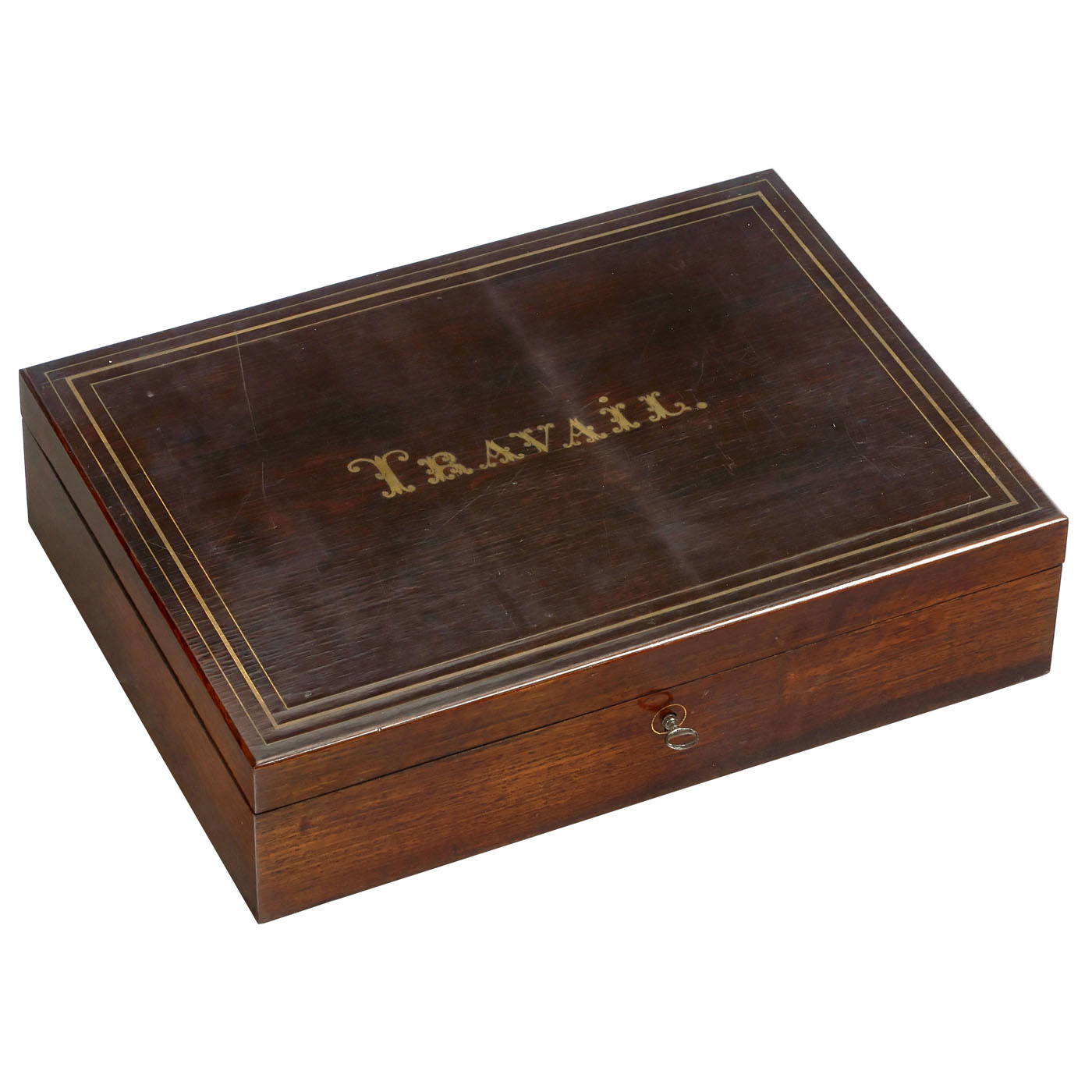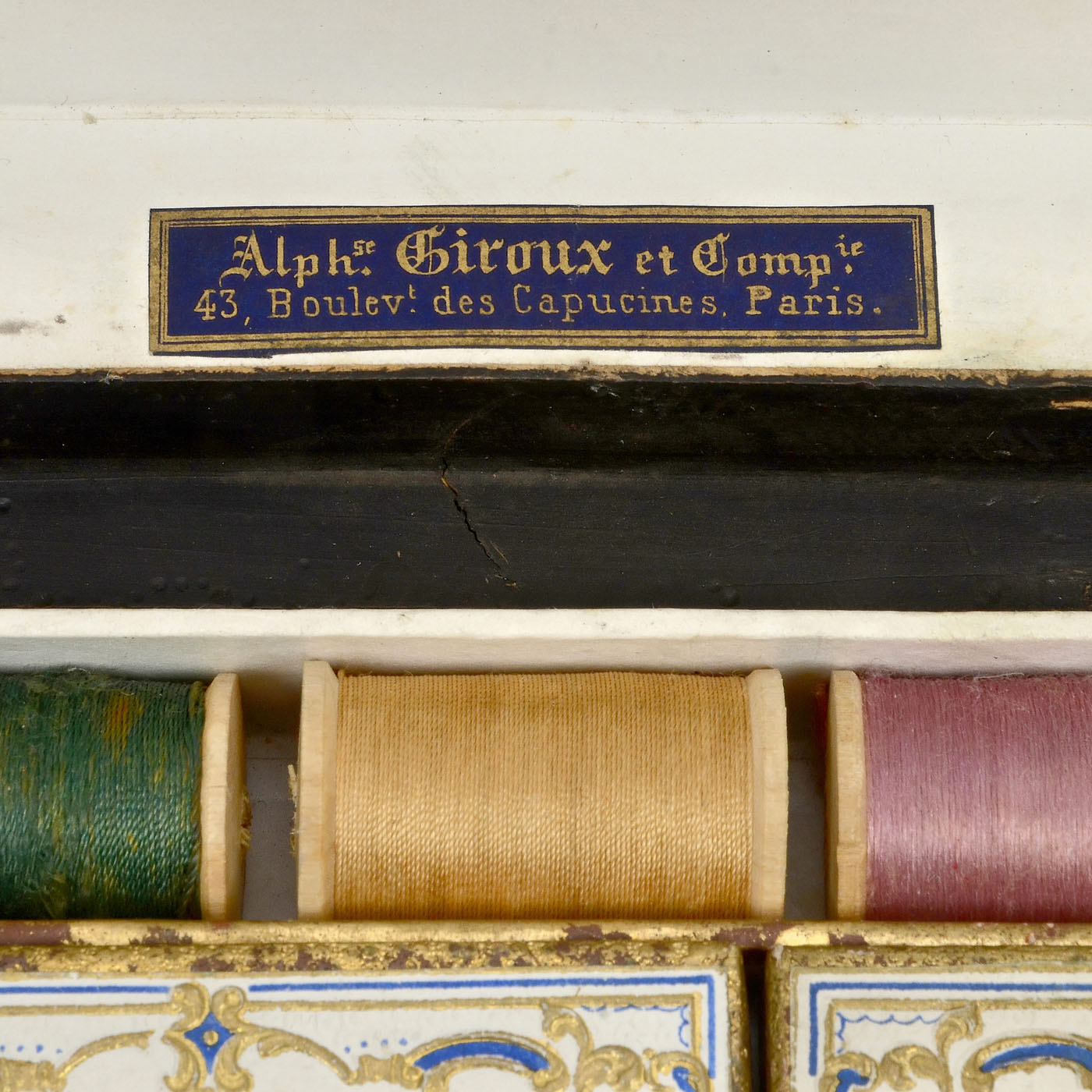 Alph. Giroux et Comp.ie, 43, Boulev. des Capucines, Paris. Sewing box inlaid "Travail" (work or handywork) in brass on the lid, dimensions: 40 x 30 x 9.5 cm, inside filled with contemporary sewing utensils.