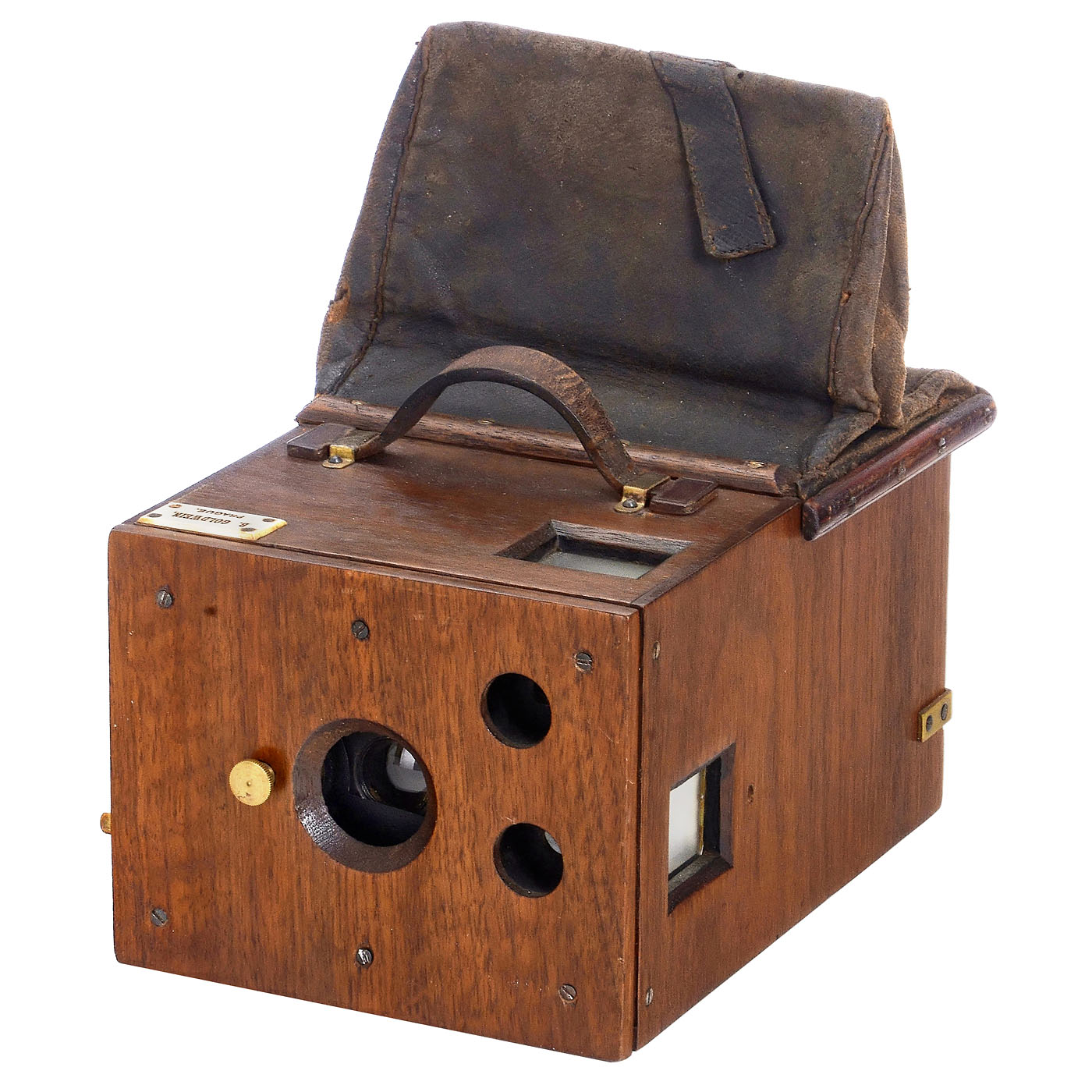 B. Goldwein, Prague. Magazine camera for glass plates in 9 x 12 cm format, fine wood casing (presumably mahogany), leather interchangeable case, Anastigmat lens, guillotine shutter (releases), 2 viewfinders, inserted cassettes. Version with manufacturer's plate. Very rare detective camera, which has increased significantly in value over the last 10 years.