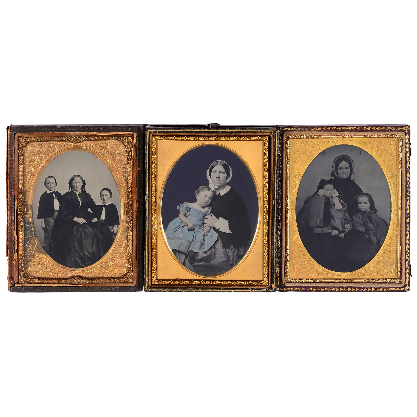 All in 12 x 9.5 cm cases or leather frames. Exquisitely composed portraits of this timeless subject, in very good condition. Suitable for any high-quality exhibition on the history of photography. The coloring of the central image is masterful.