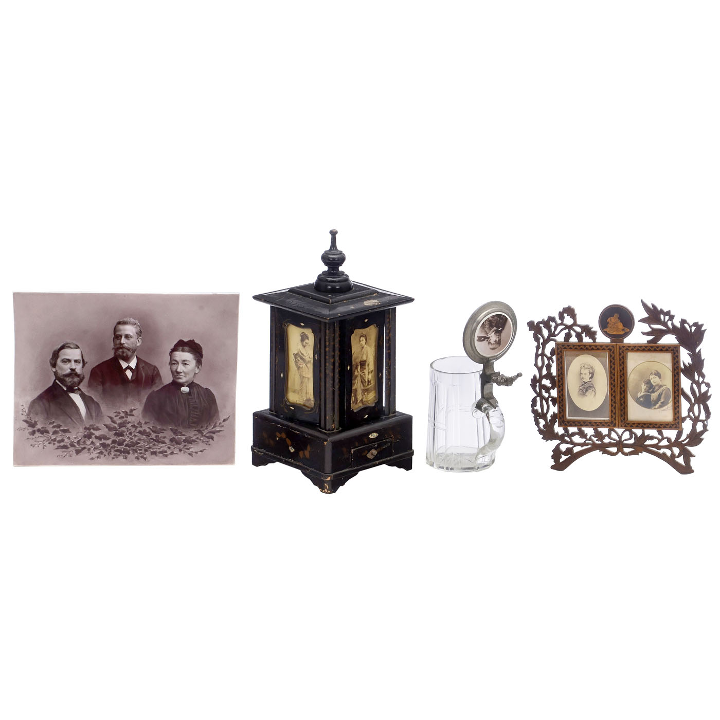 1) Japan, c. 1860. Cigar box with four doors, each adorned with albumen prints of young Japanese women (perhaps geishas) of the period, when gentlemen preferred smoking cigars; with a rotating mechanism and a turned-wood knob; drawer for a lighter. ÿ 2) KPM Berlin. Coffee cup with a photograph of a portrait of Prince Friedrich Karl of Prussia in uniform; damaged. ÿ 3) KPM, Berlin. Large porcelain plate with a family portrait; dimensions marked on the back: 275 x 223 mm; an unusually large size and very rare. ÿ 4) Carl Tielsch Porcelain Factory, Altwasser, Silesia. Chocolate cup with a portrait, inscribed "In memory of Father Kr