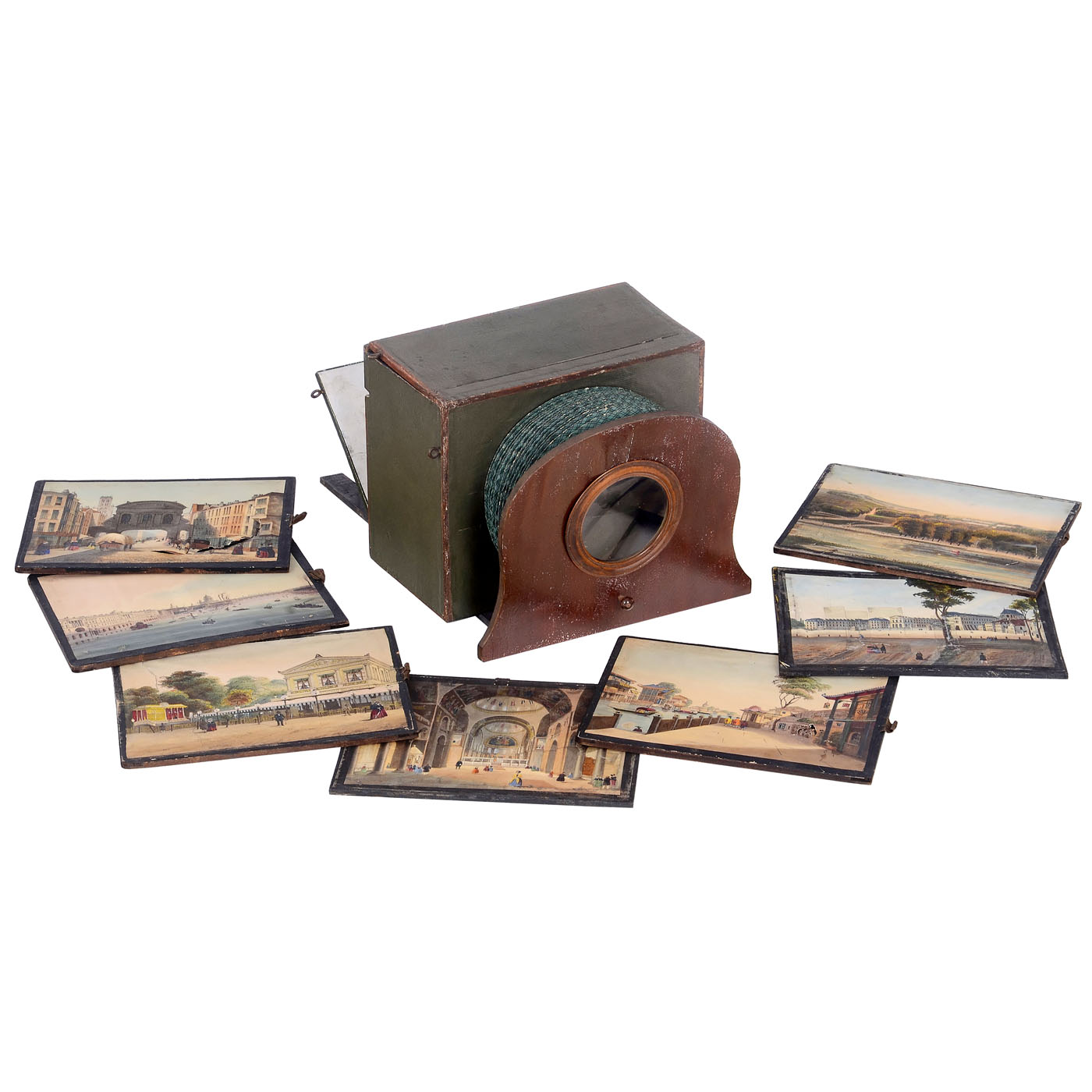 France. 1) Polyorama Panoptique, the extra-large image viewer for day-and-night translucent images 24 x 19.1 cm in size, viewer size 26 x 38 cm, height 21 cm, green bellows undamaged, mahogany front with a framed lens measuring 8.4 cm in diameter, case covered with green decorative paper. Viewer in good condition. One panel, "La Tamise