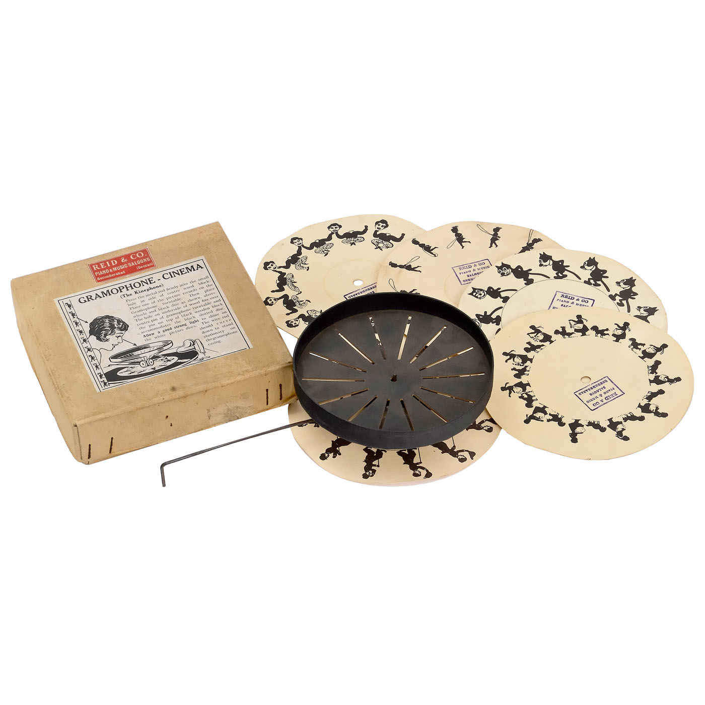 An attractive optical toy by Reid & Co., Secunderabad, India, a variation of the "Phenakistiscope". Complete set of 5 picture discs, slotted disc and all accessories, to be used on an ordinary gramophone.