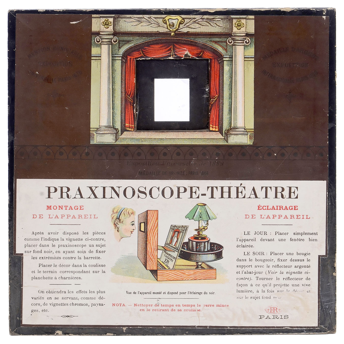 Reynaud, Paris. With 8 ? in. (22 cm) diameter lacquered metal drum, with all mirrors (one fogged), candle holder, shade (replaced), in mahogany case with viewing window and card proscenium, wd. 9 ? in. (25 cm). With all 10 strips (with cracks) and with stage sets, No. 1: Interieur and No. 1 Decor originally firmly mounted), No. 2: Cirque, No. 3: Paysage and No. 3 Decor, No. 4: Neige and on bent sheet metal No. 4 Decor, as well as No. 5 the rare mirror for Decor No. 3 (with crack). Furthermore there is a pull-out mica disc in the opening of the "theater view". Good original condition.