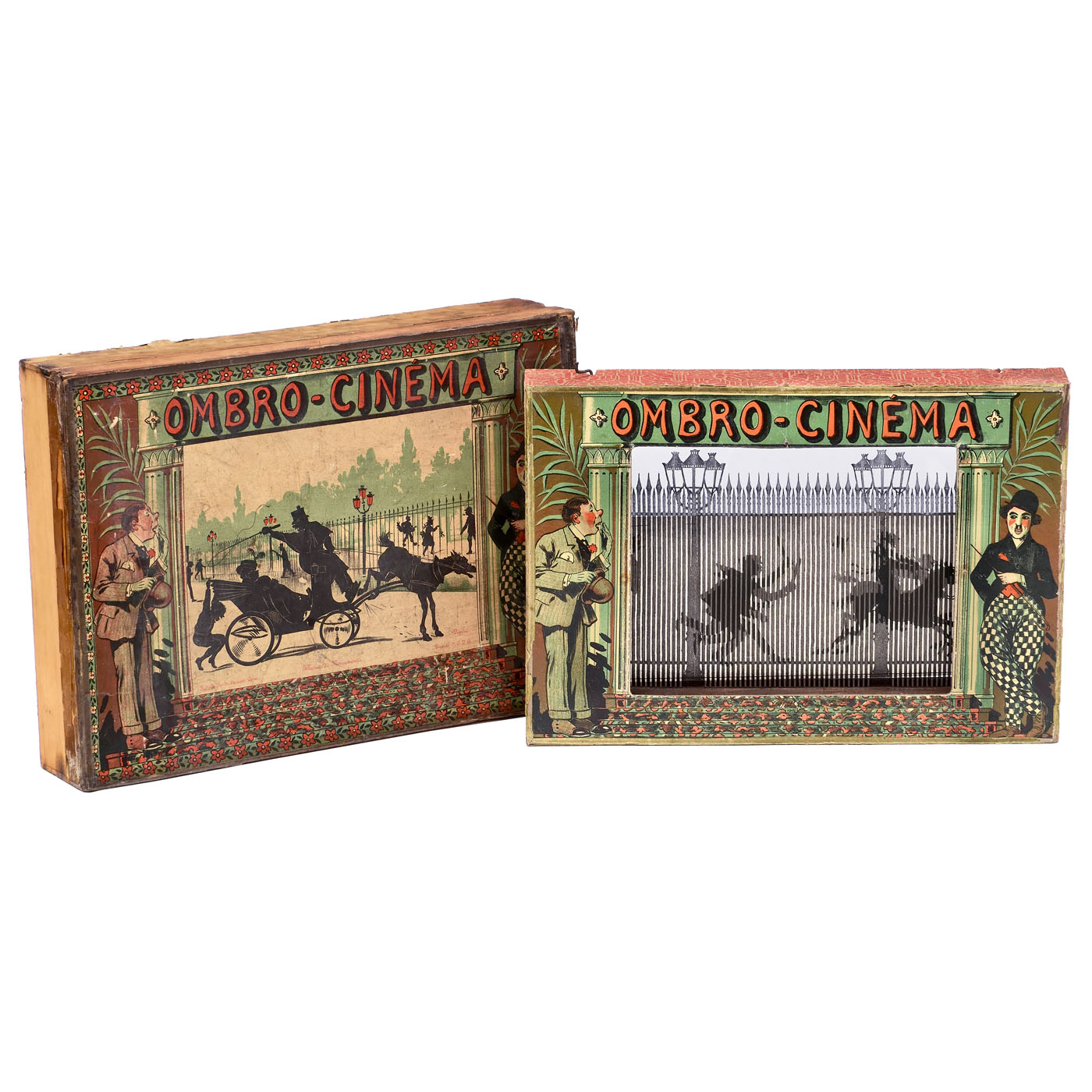 Saussine, Paris. In a 46 x 33 cm case, a viewing device for "moving" sequences of a strip panorama, lid and stage with the figure of Charlie Chaplin, with instructions inside the lid, a set-up paper theater stage with a roll-up backdrop, the inscription "Ombro-Cin