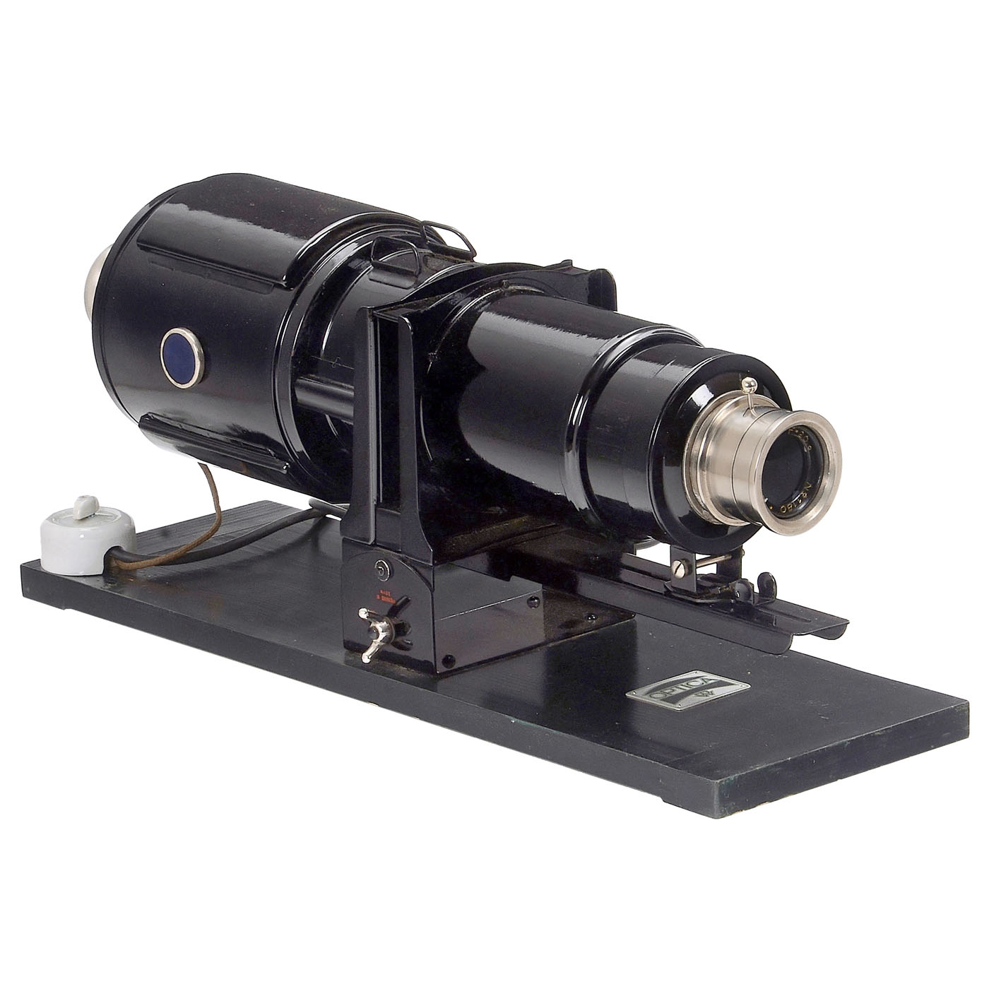 Both devices could be used as they are today. 1) Unger & Hoffmann AG, Factory for Projection Apparatus, Dresden-Berlin. Model "Siegfried", c. 1900, beautiful wood, probably reddish-stained and polished beech, L/W/H 66 x 25 x 47 cm, more recently converted for 220V/150W projection bulbs, including a modern double condenser, working, with a hidden switch inside. The 15 cm ? condenser at the front of the device is cleverly designed to be lifted for cleaning. Green interchangeable bellows, extension to approximately 35 cm, with a Rodenstock Splendon 250 mm interchangeable lens in a focusing mount.