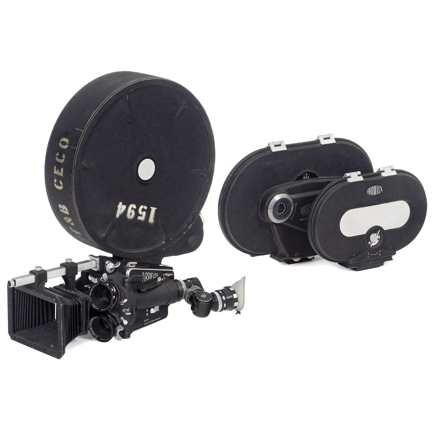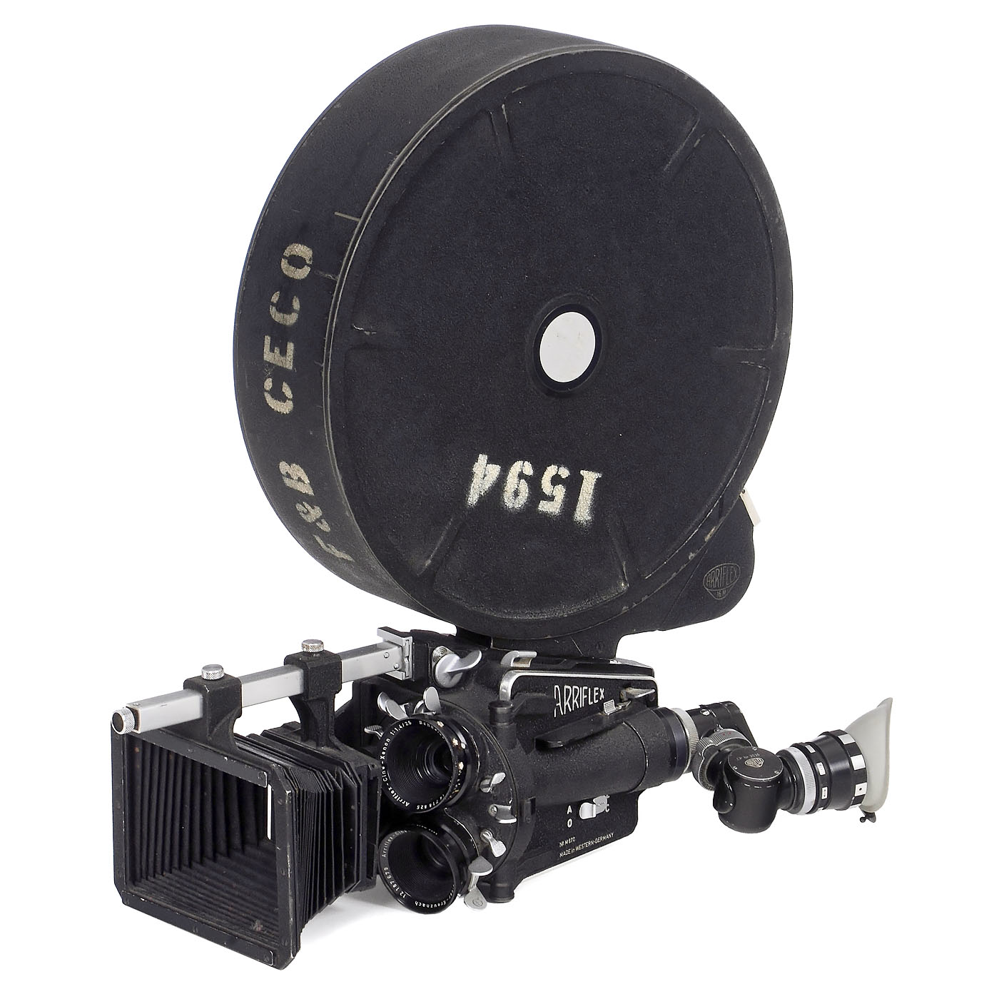 Arnold & Richter, Munich. Arriflex 16 M reflex camera for 16mm film. Three interchangeable lenses on a turret mount: Schneider-Kreuznach 1.4/16mm, 1.4/25mm, and 2/35mm. Angled viewfinder, instruction manual, and handcrank motor. Special feature: The camera comes with three different film magazines: One for 60m, one for 120m film rolls, and the rare 300m magazine for 16mm film (coaxial design). The camera is in near-mint condition. Electrical functions have not been tested.