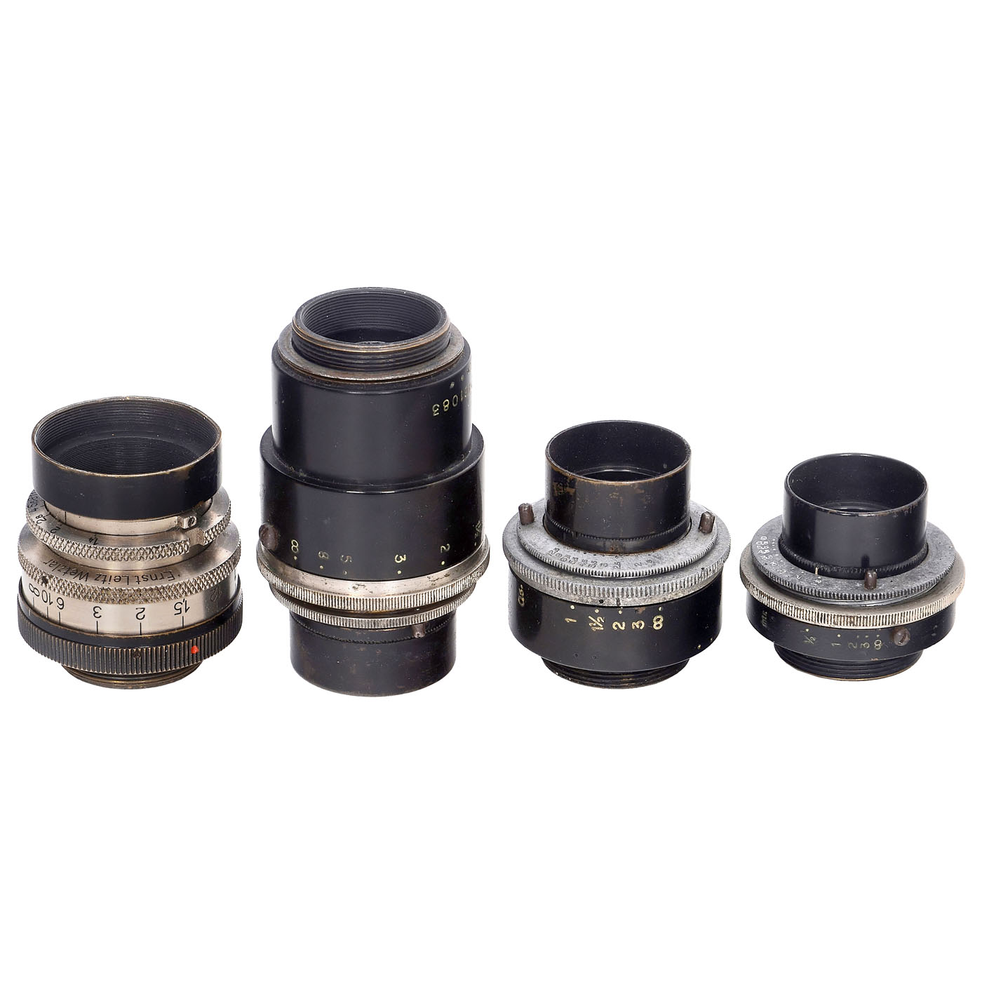 In C-mount, the focus and aperture of all lenses function, in normal to good condition under point light, all with original lens hoods. 1) R