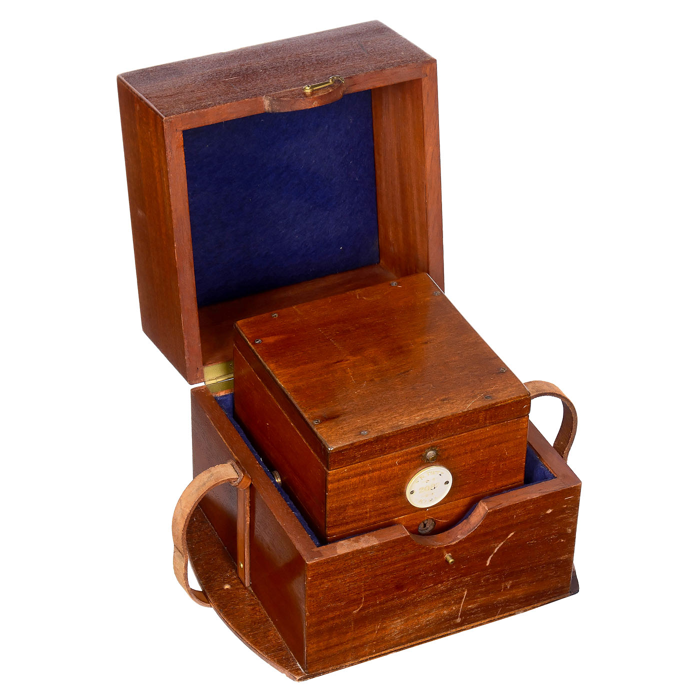 Signed "F.N. Tietz, Kiel", no. 2087, case no. 14901, with gilt full-plate brass single-chain fusee four-pillar movement, silvered dial, outer minute ring, Roman chapters, subsidiary seconds, 56-hour winding indicator, blued hands, gimbal-mounted in glazed mahogany deck box within cushioned guard case. The Tietz company also sourced its movements from England; a typical Mercer model is installed here. Working condition, with key.