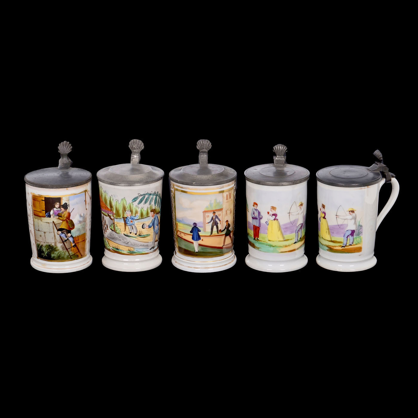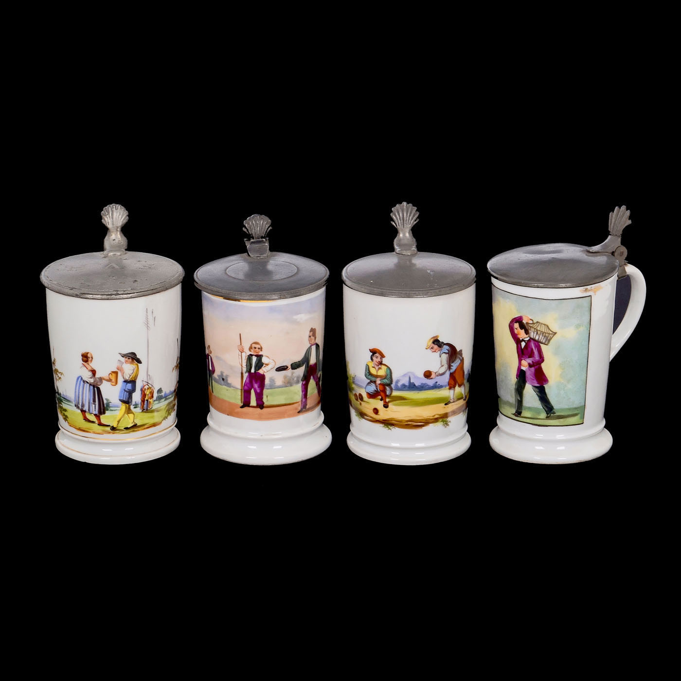Presumably Belgium, hand-painted, mostly with game or sports motifs (e.g. archery or bowling), but also a love scene, pewter lids, some marked "Mertens Anvers", height approx. 13 cm each, one jug with a hairline crack, otherwise used condition.