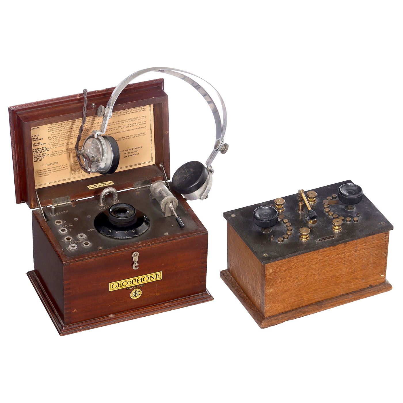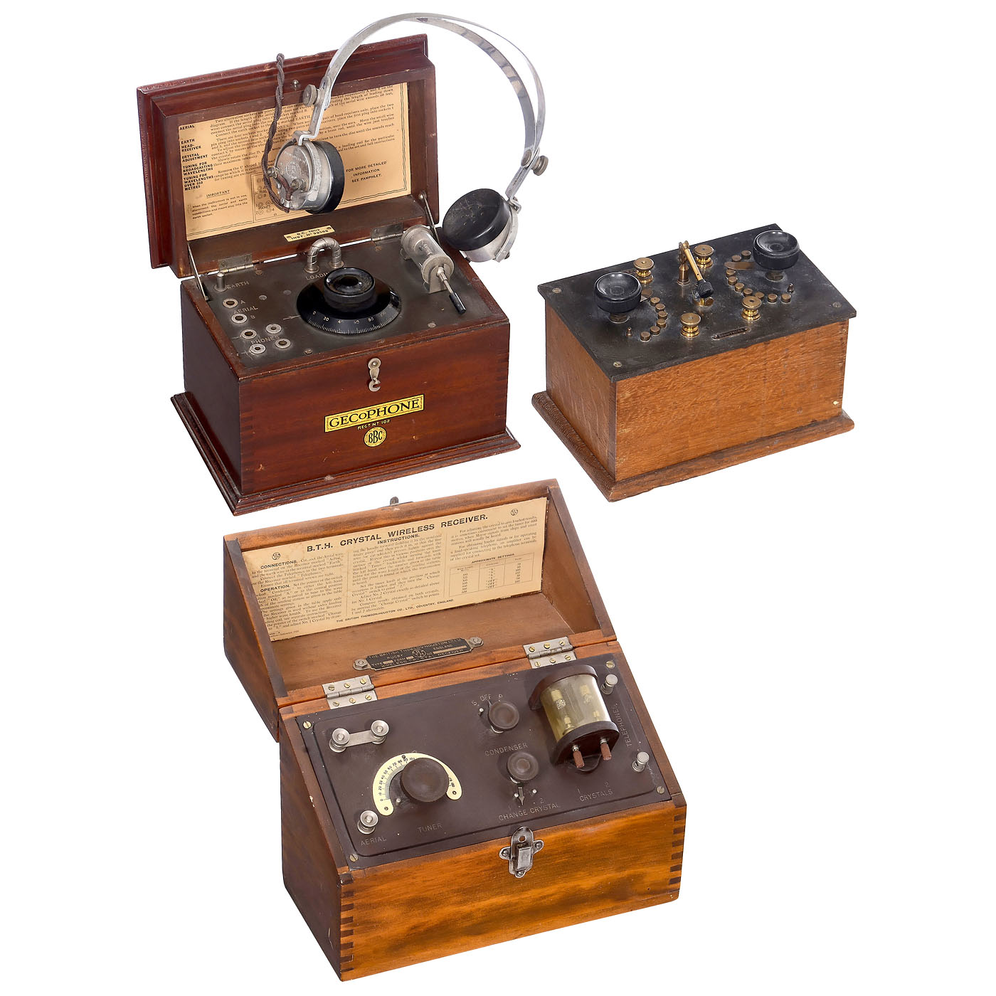 1) "Gecophone" Crystal Set No. 1, 1922, Type B.C. 1002, with BBC decal, instructions under the lid, good condition, with Sterling earphones. ÿ 2) Double crystal receiver, The British Thomson-Houston Company, crystal selectable with switch, slanted console device. ÿ And: 3) Vitus, France, presumably a replica, oak cabinet.
