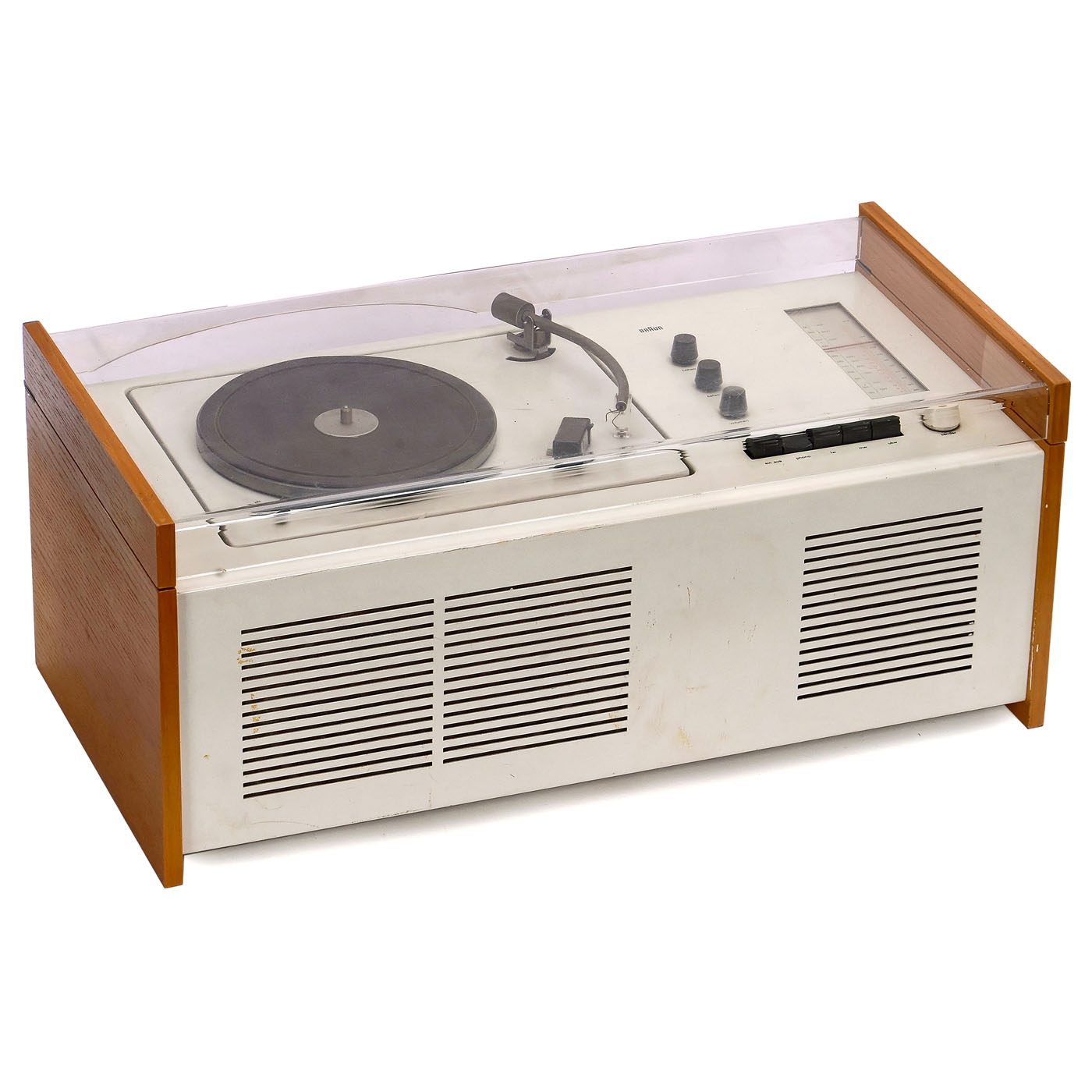 Braun, Frankfurt. Radio receiver and record player, 110/220 volts AC, long wave, medium wave and FM, built-in dynamic speaker, record player with three speeds, white-lacquered metal case with ash-veneered wood sides and acrylic cover, good optical condition, record player defective, pickup loose enclosed, radio and amplifier working. With quick start guide and circuit diagram.