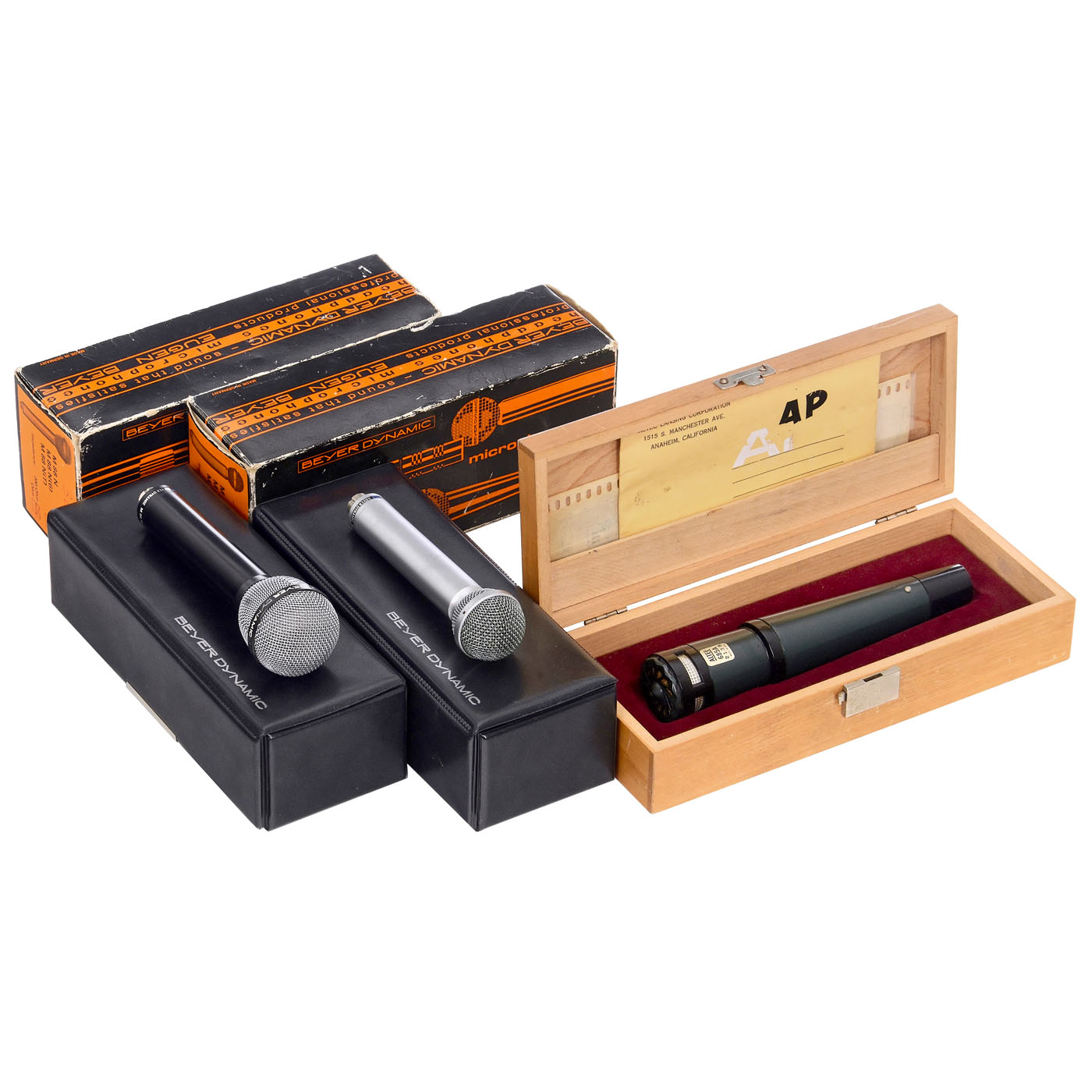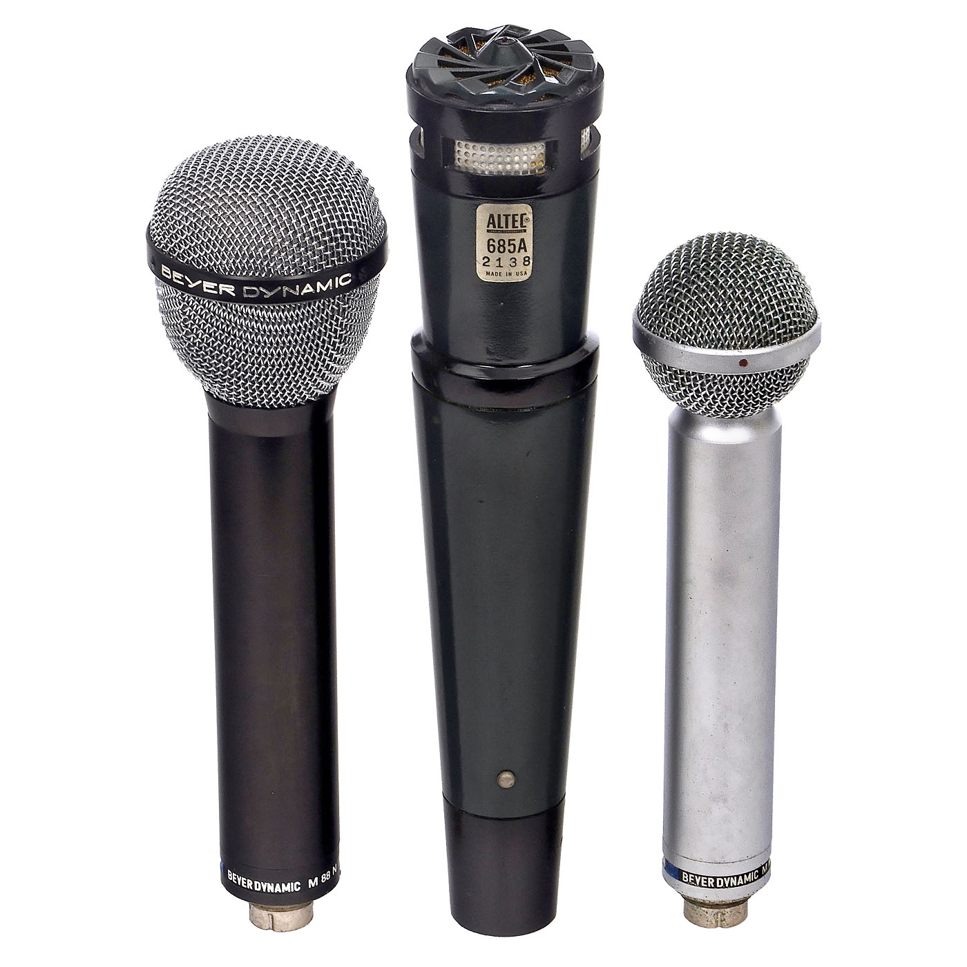 1) Beyer Dynamic M 88 N(C), Eugen Beyer, Germany, no. 30703, unidirectional dynamic studio microphone, transmission range 30ÿ20,000 Hz, 200 ohms impedance, 3-pin Tuchel connection, good optical condition, untested, with English and German instructions in box. ÿ 2) Altec 685A, USA, no. 2138, cardioid professional dynamic microphone, frequency response 40 to 16,000 cycles, 150/200 ohms impedance, 5-pin connection, good optical condition, untested, with English instructions in wood box. ÿ And: 3) Beyer Dynamic M 160 N, Eugen Beyer, Germany, no. 15016, unidirectional dynamic studio microphone, transmission range 40ÿ18,000 Hz, 200 ohms impedance, 3-pin Tuchel connection, good optical condition, untested, with English and German instructions in box. ÿ In addition: 2 defective microphones by B.S.T., Japan.