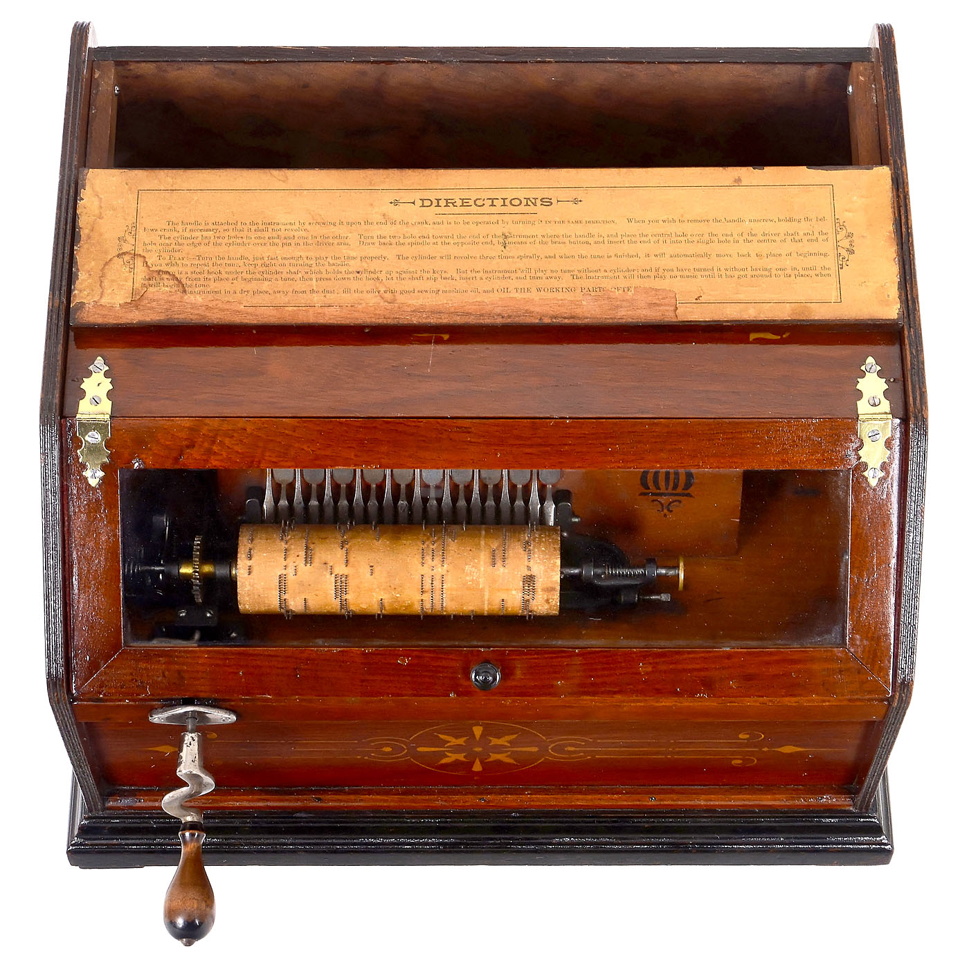 The Autophone Company, New York. Organette with 20 notes, for spirally-pinned wood cobs playing one air on three revolutions, gilt-stenciled wood case, size 18 x 15 x 12 ? in., excellent playing condition, with 12 cobs.