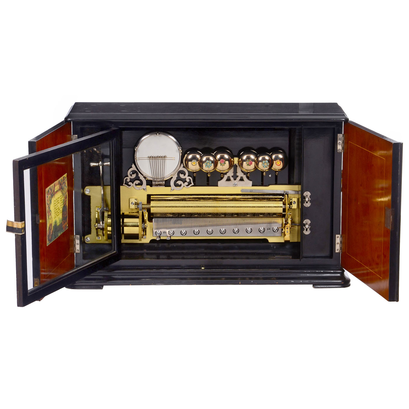 Switzerland, playing eight airs accompanied by six optional saucer bells with polychrome flower finials and skin-drum with ten beaters, 93 teeth in comb (complete), lever-wound double-spring motor, brass movement, copy tune-sheet, upright wood case, ebonized top and plinth, double-doors with root wood veneer and brass and mother-of-pearl inlays, small crack on the left door, brass carrying handles, case: wd. 27 1/4 x ht. 9 x dp. 17?? in. (70 x 23 x 45 cm), cylinder 15 in. (38 cm), with cabinet key.