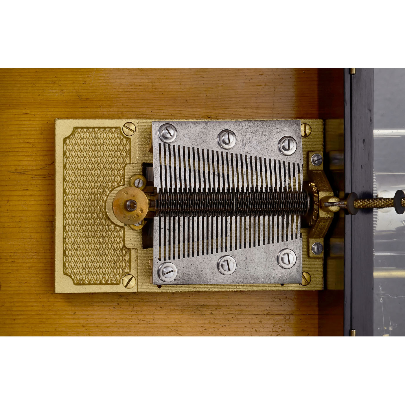 Heinrich Zimmermann, Leipzig. For 11-inch discs, 62 teeth in two steel combs (complete), lid with original lithograph, visible motor under glass, marquetry-inlaid lid, in wood case 19 1/3 x 14 x 9 in., very good playing condition, with 21 discs.