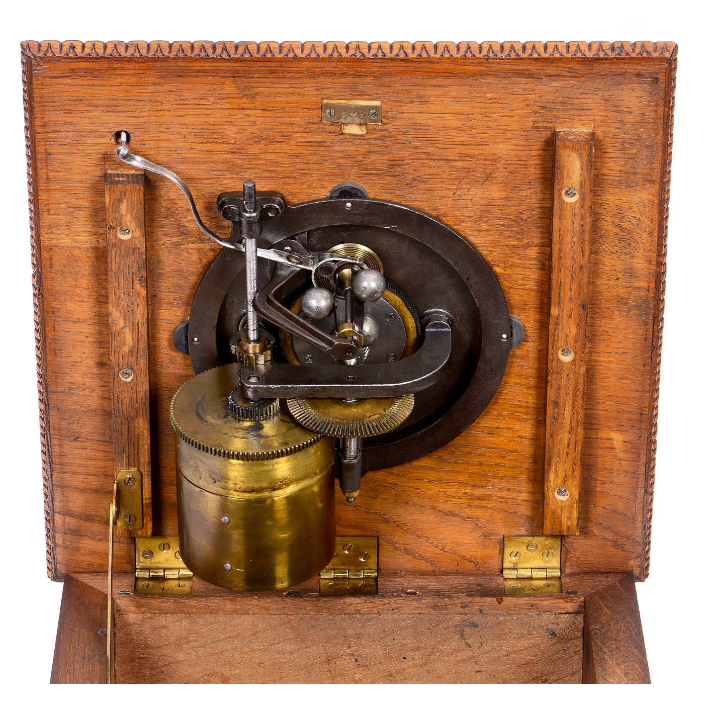 The Gramophone & Typewriter Ltd., London, manufactured for the French market, no. 12153. Carved oak case, four columns, with maker's decal and "Writing Angel" plaque, Exhibition reproducer, triple-spring motor, ? 12-inch turntable, original lacquered arm, nickel-plated brass horn, ? 16 ? in., length 27 in., very good working original condition.