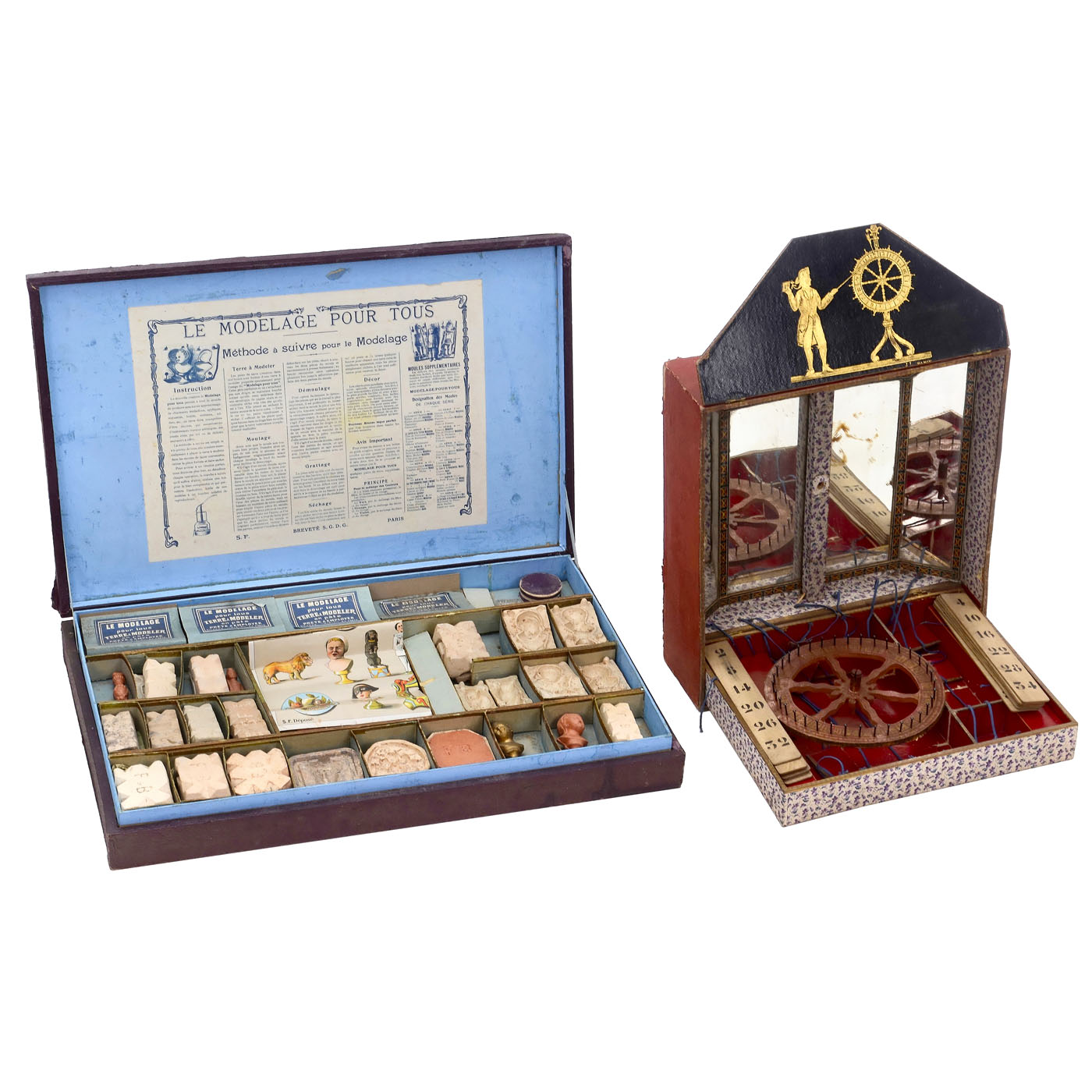 1) "Le Modelage pour Tous" (Modeling for everyone), SF Paris, SGDG patented, 2 broken and 3 incomplete molds, see photo, box somewhat torn, the compartments on the upper row are empty, they contained the clay for moulding.