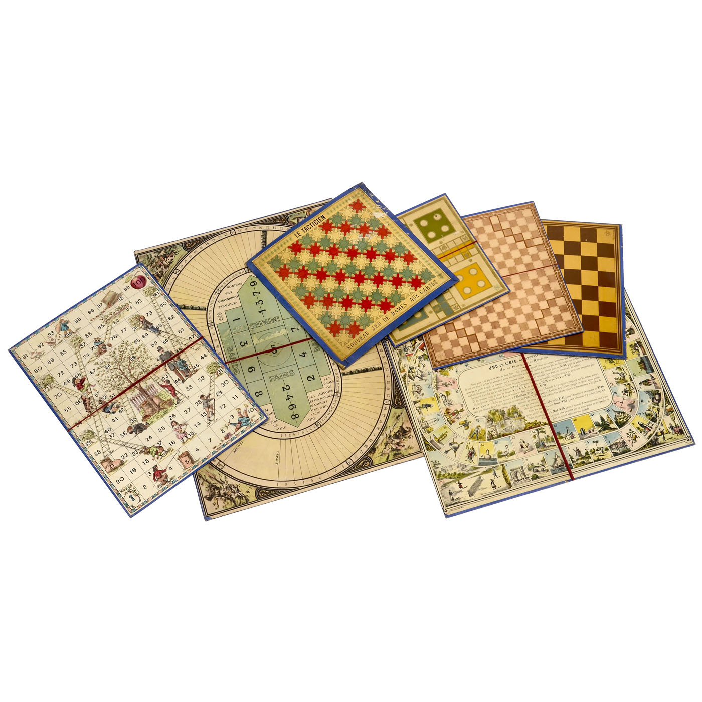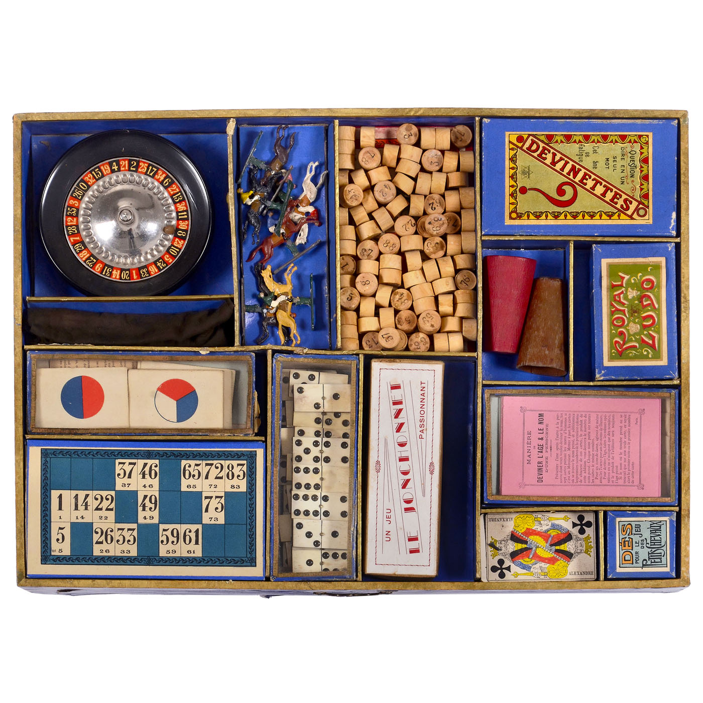 Large games box containing approx. 30 different games, including "Les Osselets" (knucklebones), "Jeu des sept Familles" (family quartet), "Devinettes" (question and answer game), "Royal Ludo" (Pachisi), "Le Jonchonnet" (Mikado), flea jumping, horse racing, roulette, board games and a very decorative war game presumably depicting