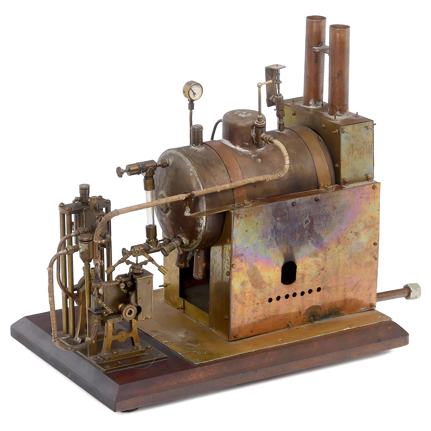 Handmade brass model, gas-fired, large boiler, length 9?? in., ? 4 ? in., with pressure gauge, pressure relief valve and water level glass, working speed regulator, slide control, on wooden base, 13 ? x 10 in., running smoothly but untested.