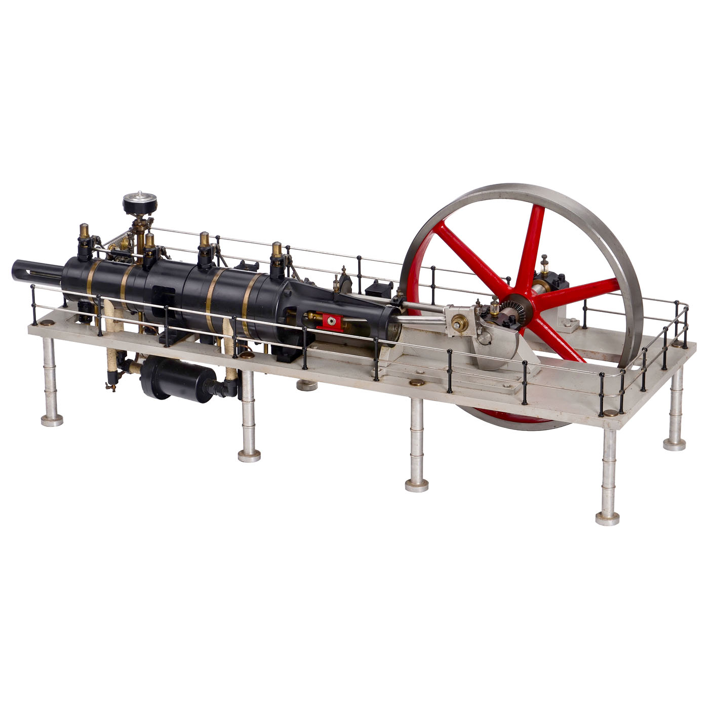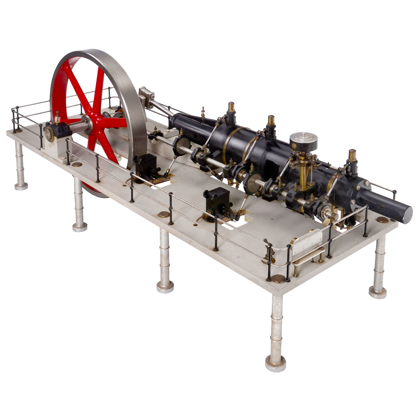 England, precision workmanship in stainless steel, only the flywheel (? 17 in.) is made of cast metal, two-cylinder compound steam engine with high- and low-pressure cylinders (? 3 and 4 ? in.), valve control via eccentric rings, functioning speed regulator, steam cooler (condenser), 2 oil pumps, 12 glass oilers, 2 pressure gauges, overall dimensions 46 ? x 19 1/3 x 19 in., tested with compressed air, in working order.