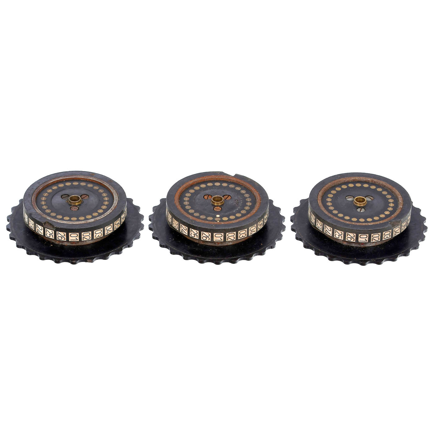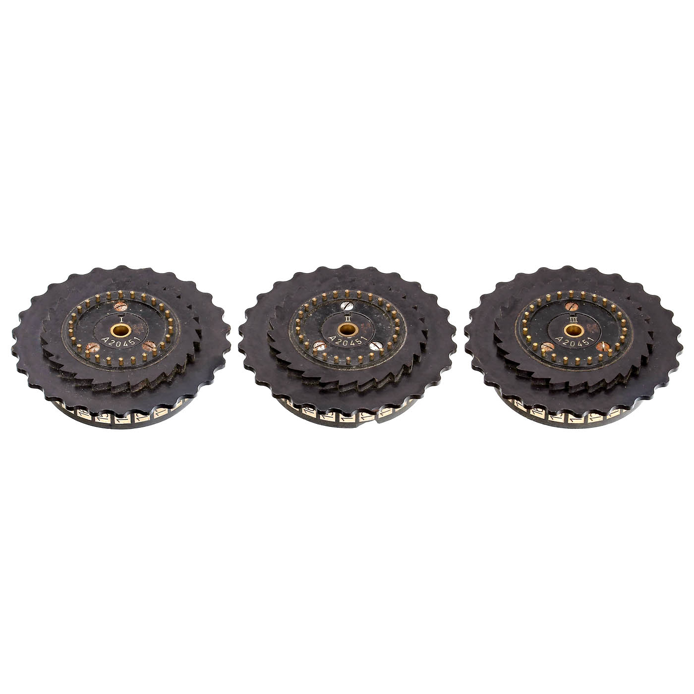 Chiffriermaschinenfabrik Heimsoeth & Rinke, Berlin. Serial no. "A 20451 / jla / 1944". With 3 original wheels, marked: (I) A 20451, (II) A 20451 and (III) A 20451, each with one notch, reflector wheel marked A 20451, all wheels with embossed eagle and Swastika, standard QWERTZ keyboard of 26 keys, white symbols on black backgrounds, battery switch, plugboard, battery casing, metal case with brown finish.
