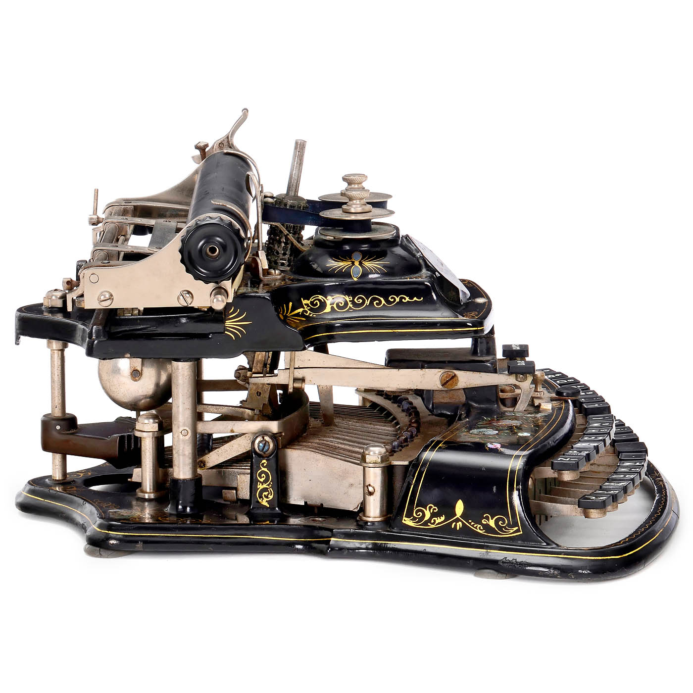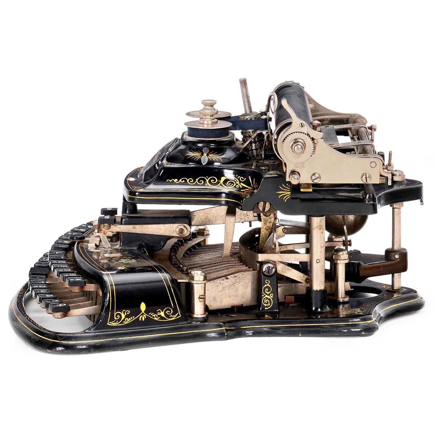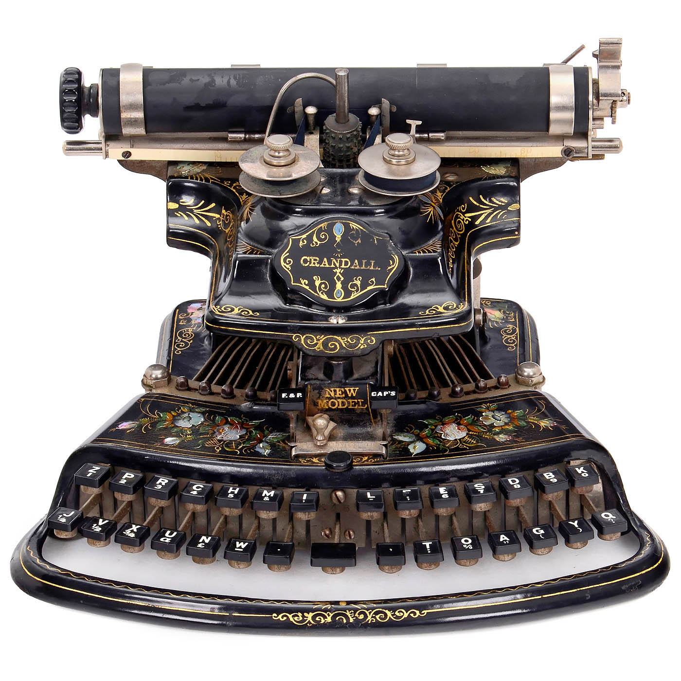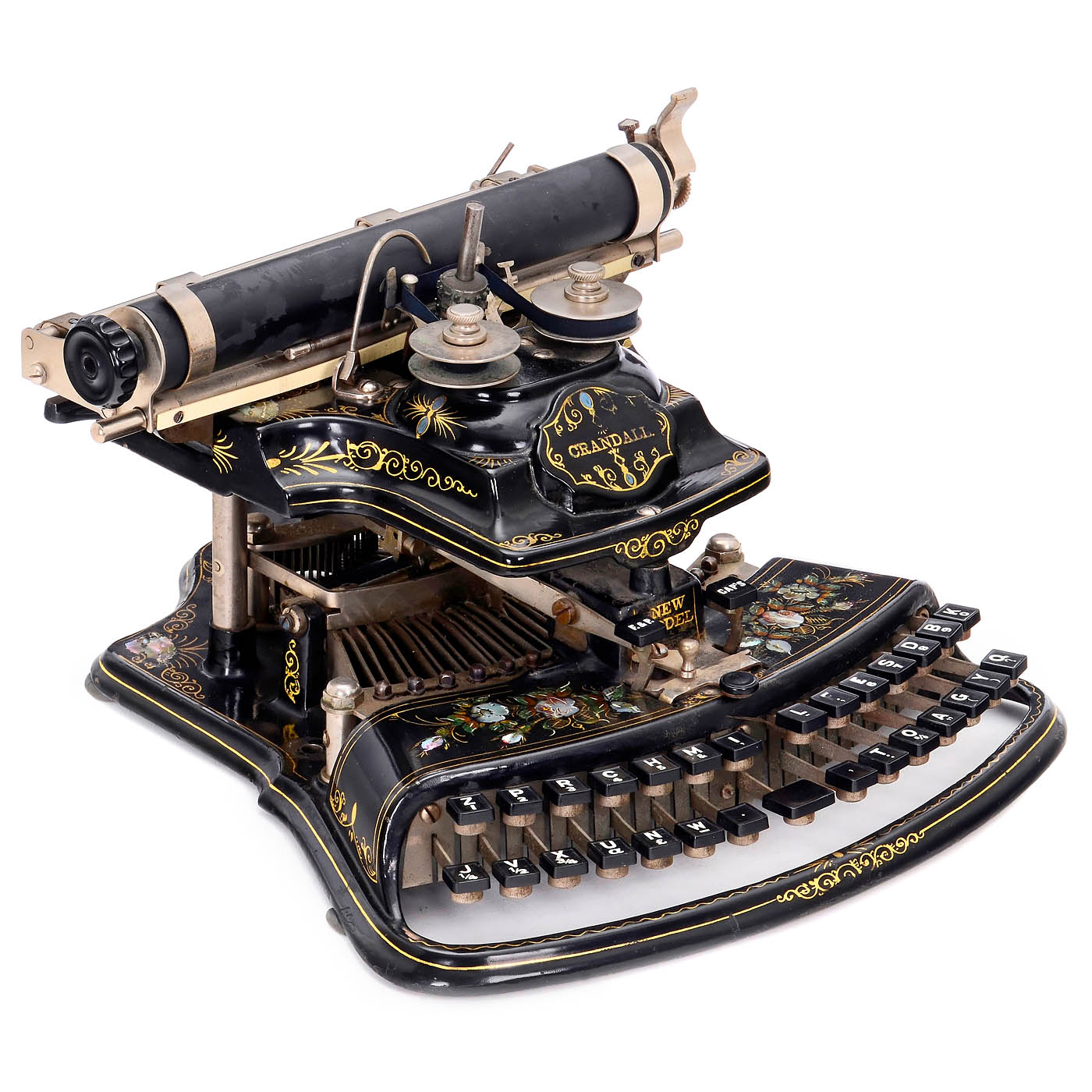 The Crandall Type Writer Co., Syracuse, N.Y. Serial no. 6467, with vertical type sleeve and curved two-row keyboard, one of the most attractive typewriters with its mother-of-pearl and gilt decoration, platen rubber torn, type sleeve does not turn, very good original optical condition. – A superb pioneer of office communication, collector's item and museum piece. – In addition: book: "American Typewriters" by Paul Lippman.