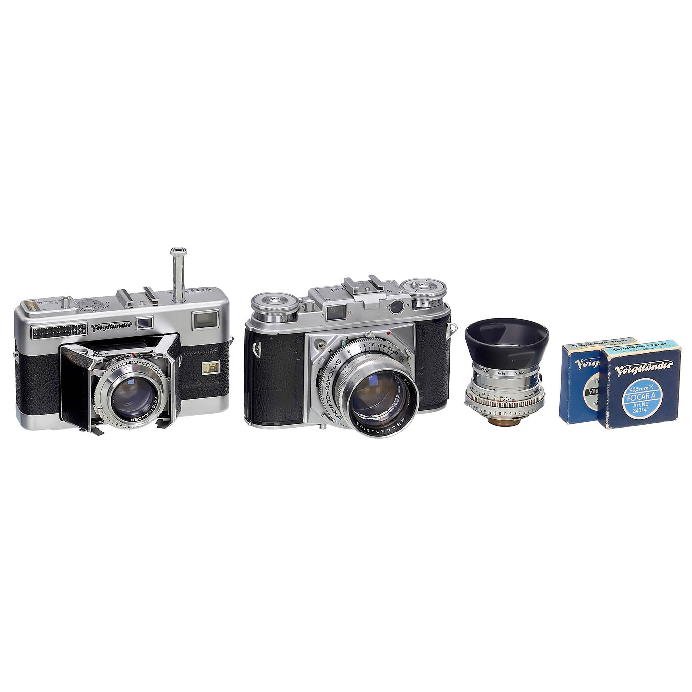 Voigtl?nder, Braunschweig. 1) Prominent, first model, with flash shoe (which has caused scratches on the back), Nokton 1.5/50 mm no. 3321788, 2 small scratches on the front element, otherwise glass clean under point light, shutter working. (3/3) – 2) Vitessa, second model, 1958 onwards, Ultron 2/50 mm no. 4158210, some spots visible inside the back element under point light, exposure meter with plausible readings, shutter working. (2/3-) – And: 3) Skoparet 3.4/35 mm, glass good under point light. (3/3)