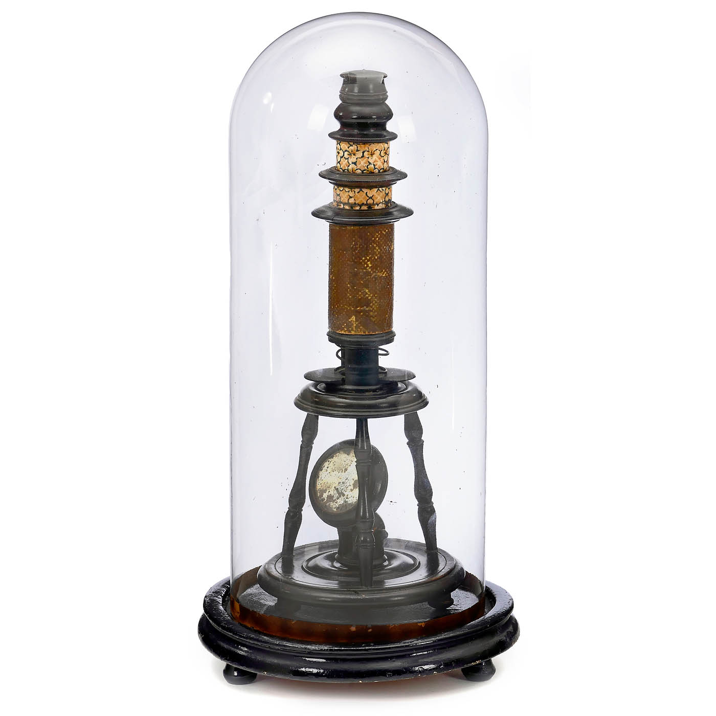 Fruit wood, paper and cardboard; original condition; height 12 ? in., 1 eyepiece (with dust cover), 1 objective lens, Bonanni spring stage; coarse and fine adjustment by moving the paper-covered tube (some paper loss on the inner tube), typical brand mark under the base "JFF" (in a heart), the mirror is slightly blind; functional, low magnification as is usual for this type of microscope; under glass cover.