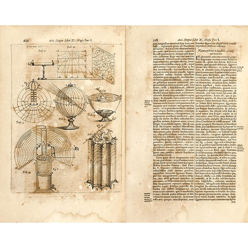 "Ars Magna Lucis et Umbrae", In X Libros digesta, Amsterdam 1671, edited by Joannes Janssonius-Waesberghe. 810 pages + 9 plates, with numerous wood engravings and one neat portrait, 43 copperplates and one large copperplate "Horoscopium Catholicum Societ. Jesu", 67 x 43,5 cm. – Brown leather-bound volume, with minimal moudly. – Kircher (1602–1680) was a major German academic and famous Egyptologist, in 1646 published his legendary work "Ars Magna Lucis et Umbrae", which included revolutionary advances in projecting images. He observed the sun using the camera obscura. It is impossible to know for sure, but at some point during these four years (1640–44) Kircher is believed to have presented a slide show which was projected onto a screen with illumination from behind by a candle. In 1646 Kircher had published his "Ars Magna" (1st edition, Rome) which detailed the camera obscura and magic lantern! The name mentioned the most in reference to the magic lantern, Kircher describes it in his "Ars Magna Lucis et Umbrae" (The Great Art of Light and Shadow, 1st ed. vol. 10, Rome, Italy, 1646) and illustrates a nearly room-sized camera obscura (plate 28 of vol. 10. sec. 2). In the last volume he explains the magic lantern and its use. Kircher describes a construction of a camera similar to that of Wotton's description (which was of Kepler's). Kircher also details in the book a revolving wheel of painted pictures, something which wasn't seen again until the 19th century. "Ars Magna" (1st ed.) did not include any illustration of the magic lantern however it did include a fine illustration of the camera obscura.