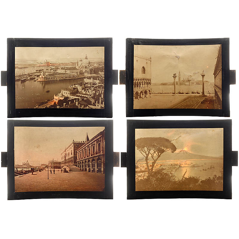 Carlo Ponti, Venezia. Tropical wood with brass fittings,approx. 35 ½ x 19 x 24 4/5 in., ground-glass screen holder (new). Otherwise excellent condition. With 14 rare Megalethoscope pictures by Carlo Ponti: 1) Battisterio della Chiesa di S. Marco. – 2) Venice. – 3) Stonumento