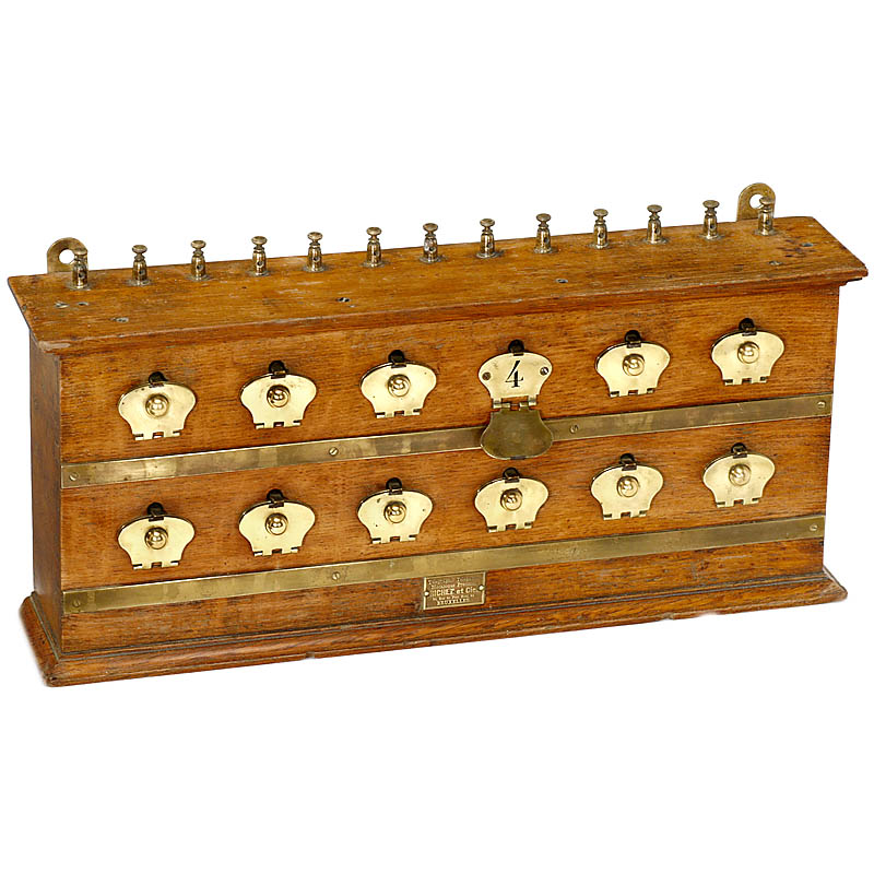 Marked: "Télégraphie Téléphonie Mécanique Précision, Richez et Cie., Bruxelles", with 12 keys, oak case, size: 18 ½ x 4 x 9 in.