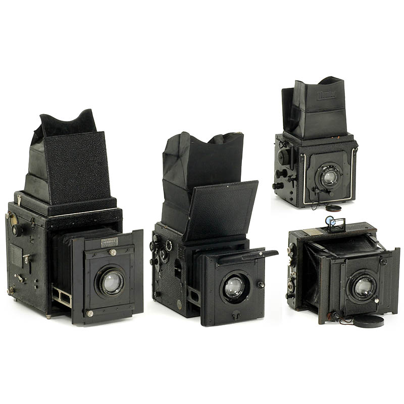 1) Hermagis, Paris. Appareils Reflex, c. 1905, SLR camera, size 9 x 12 cm, with Hermagis Anastigmat 4,5/170 mm, shutter stuck, rare French reflex camera. (2–3/4)
