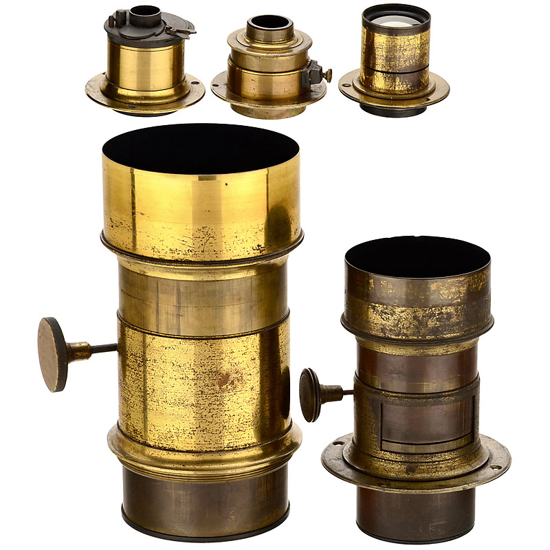 All unmarked. 1)Brass-bound lens (Petzval-type), rackand-pinion focusing, height of the lens with hood 8 ¾ in., Ø 4 1/3in., clean optics. – 2)Landscape lens, height of the lens with hood 6 ¾ in., Ø 3 1/6in., rack-andpinion focusing, for waterhouse stop, connecting ring. – 3)Small brass-bound lens for waterhouse stop, height 2 in., Ø 2 in., connecting ring. – 4)Small landscape lens with flip shutter, height 2 1/3in., Ø 2 in., connecting ring. – And:5)Brass-bound lens for waterhouse stop, height 2 1/3in., Ø 1 ½ in., connecting ring.